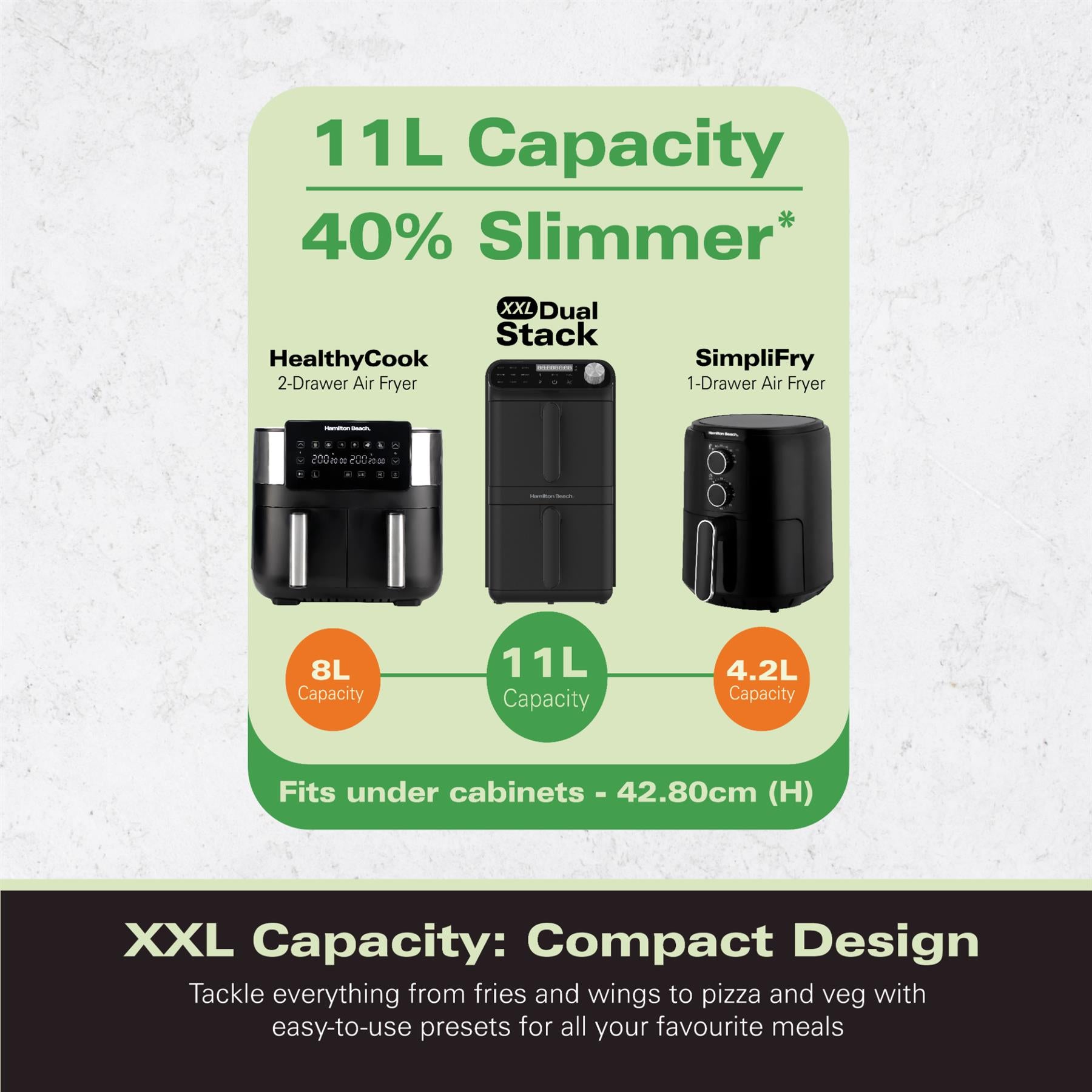 Enjoy healthier, crispy meals with little to no oil, all backed by trusted Hamilton Beach quality and a 2-year guarantee. The Hamilton Beach XXL Dual Stack Air Fryer is a must-have for efficient, space-saving, and delicious cooking.