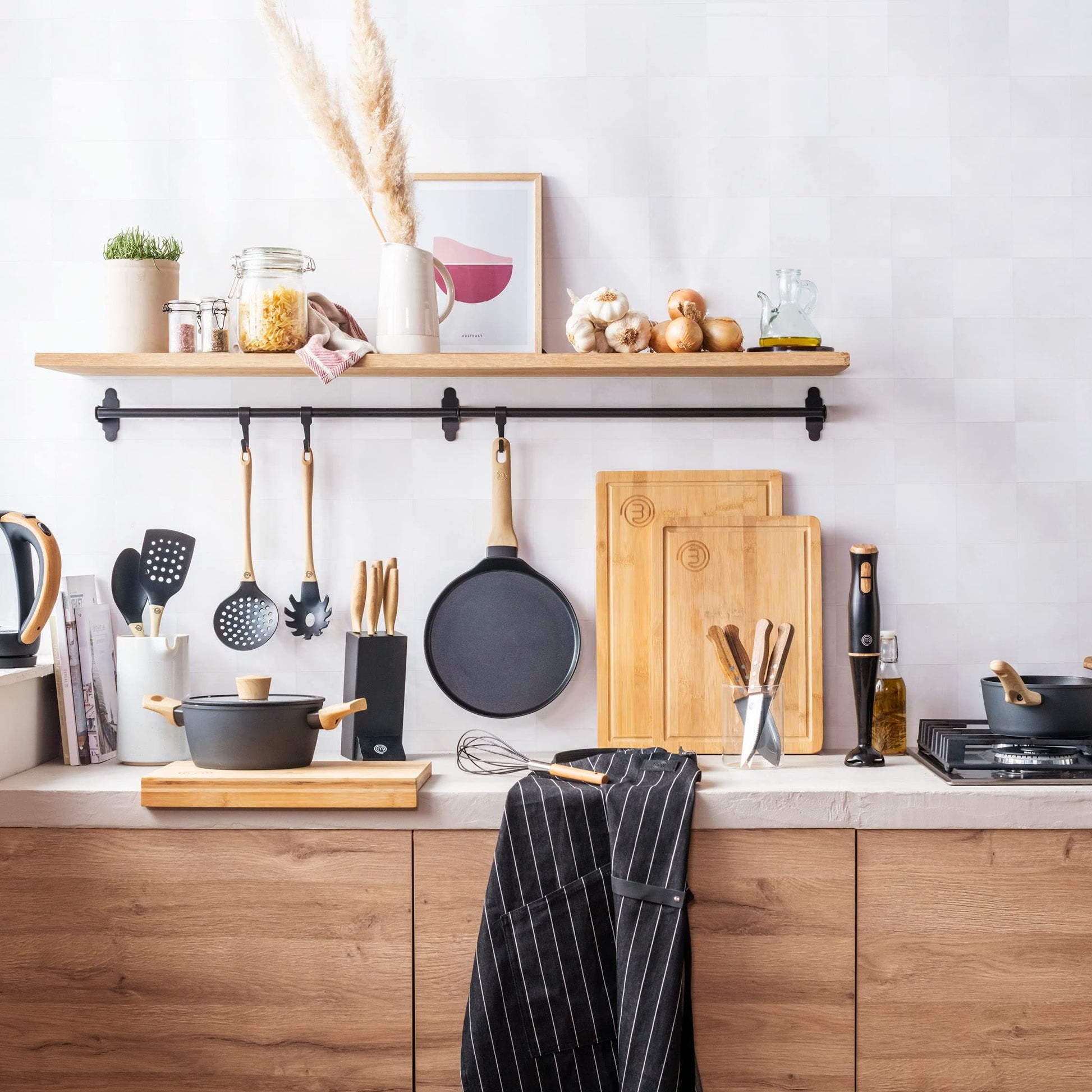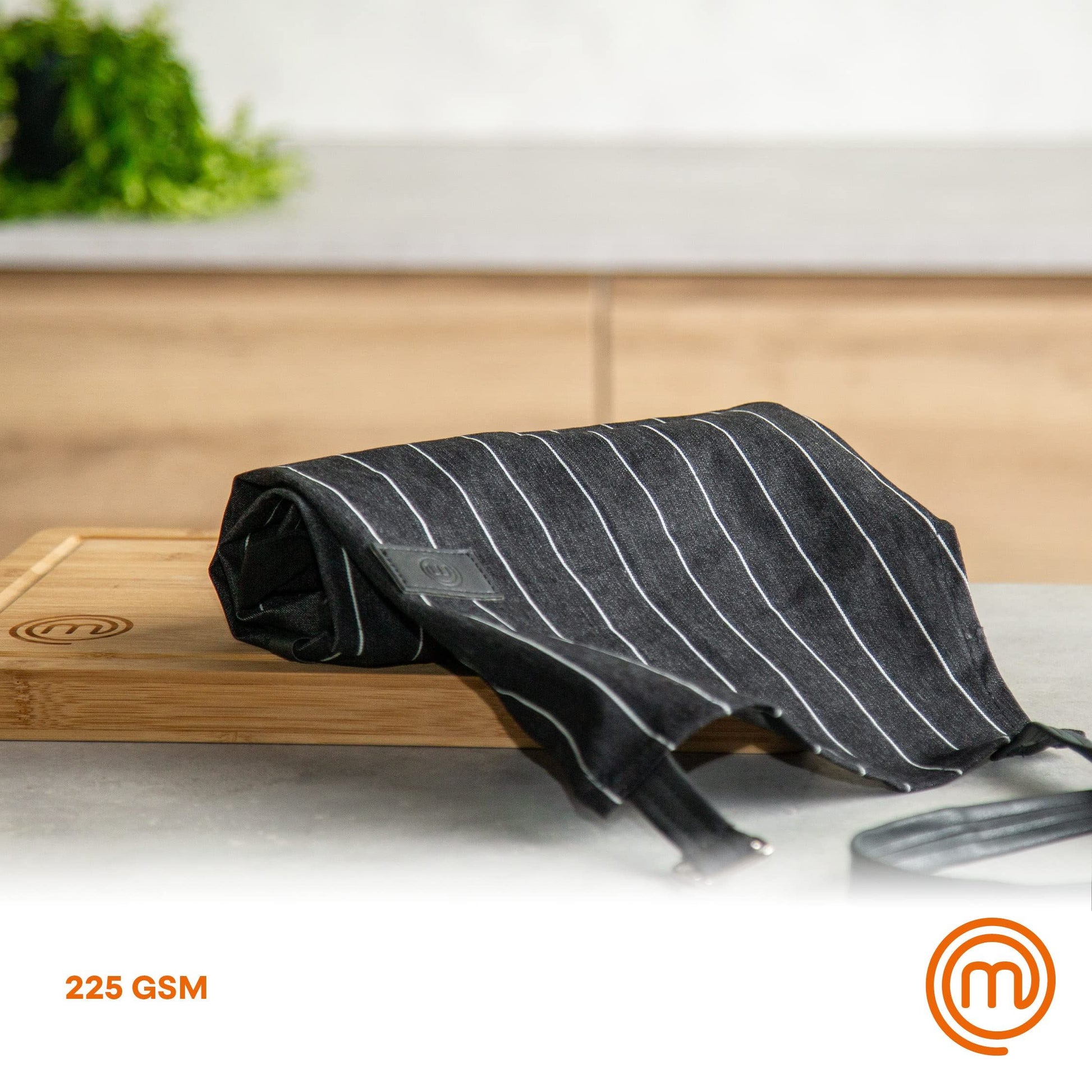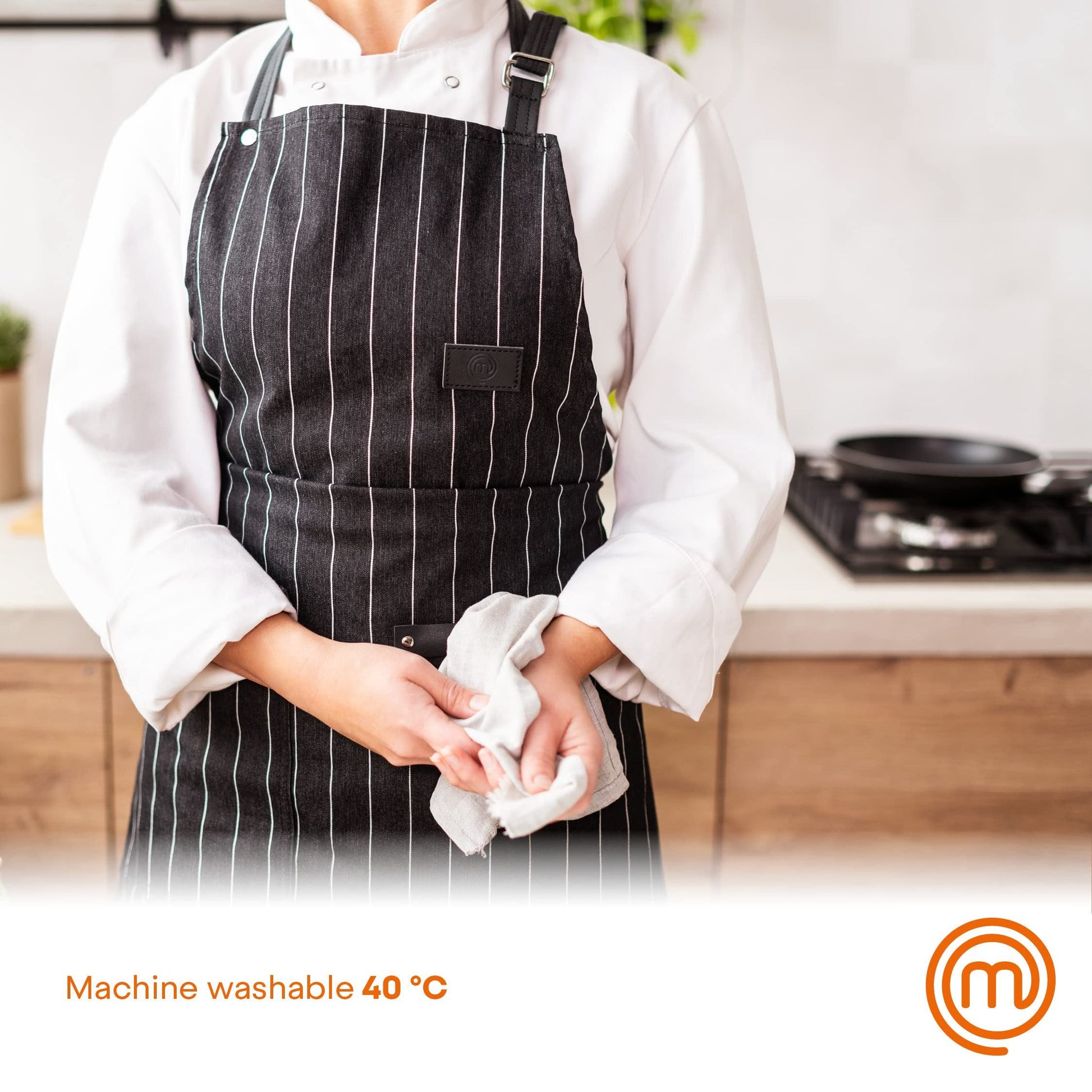 The official MasterChef apron is a classic chef-style pin stripe apron that is as easy to clean as it is to throw on. Constructed through organic cotton and vegan leather, you can throw the apron in with your other coloured laundry at 40 degrees without anxiety over coloured bleeding or shrinkage. The MasterChef apron is generous in width and length and fitted with an adjustable neck strap so that it can be tailored to the most comfortable fit for you. We advise a general range from S-XXL, making it perfect for all genders. Our textiles are all constructed with 100% high quality organic cotton for hardwearing kitchen use. Our aprons are not intended to be novelty gifts, but are actually suitable for tenuous kitchen conditions. Heat resistant up to 250 degrees celcius, our aprons and oven gloves can be safely worn when working in close proximity to heat sources such as gas stoves or ovens.