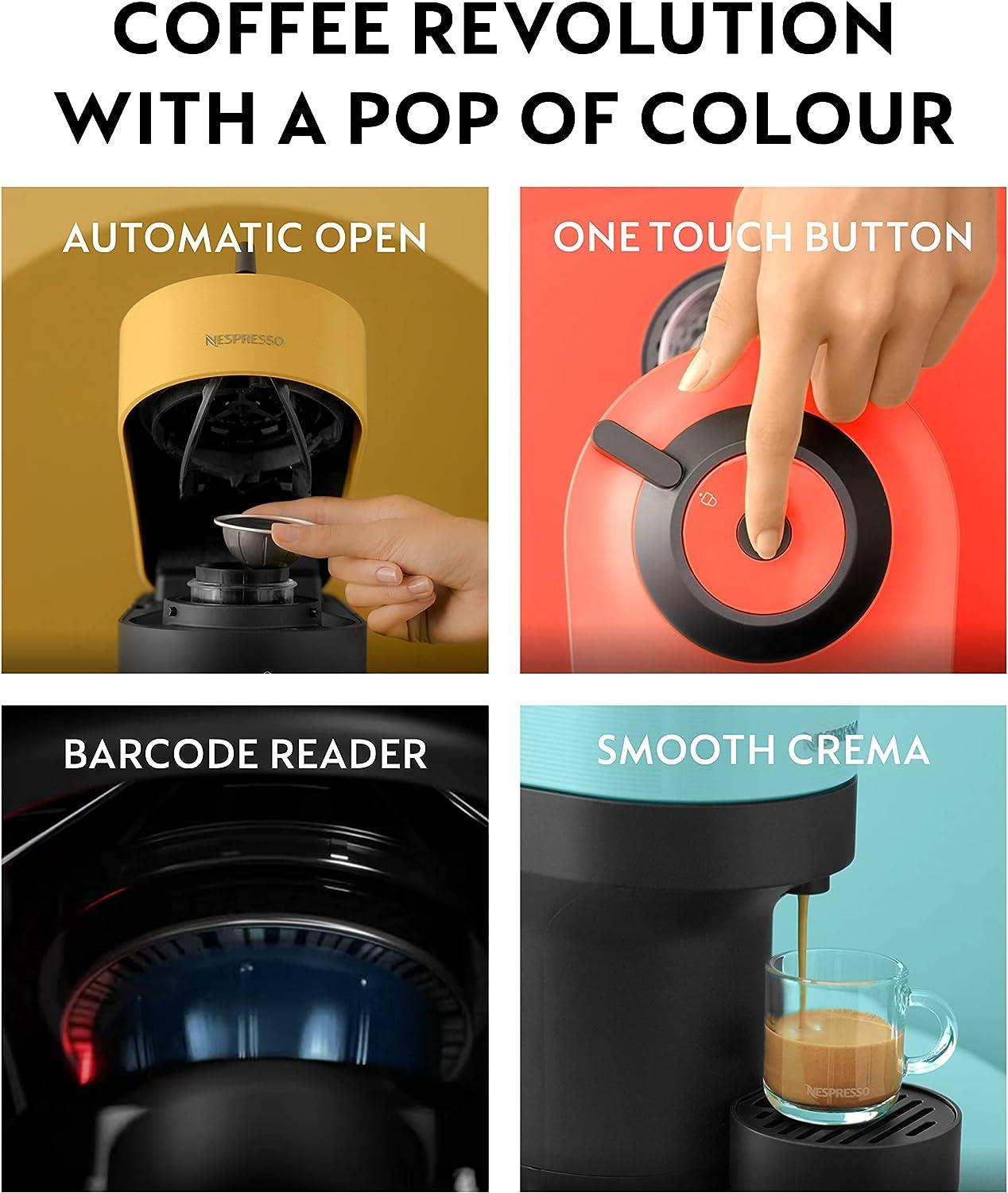 Vertuo Pop exclusively works with Nespresso Vertuo capsules, offering a range of over 30 capsules including iced and flavoured, producing velvety crema of barista quality. Smaller footprint with a water tank to match. Brews different coffee sizes: espresso 40ml, double espresso 80ml, gran lungo 150ml, large mug 230ml. Includes complimentary welcome set of 12 capsules. Fast heat up in 30 seconds, simple one-button operation with patented barcode technology that reads each capsule. Including automatic coffee pod ejection. Connect your coffee machine to your smartphone using WiFi and Bluetooth smart technology for real-time updates, and descaling alerts. Made from 35% recycled plastic. A+ energy consumption with automatic switch off after 2 minutes to help save energy. Nespresso Vertuo pods are made with 80% recycled material and are fully recyclable. Use with Nespresso Aeroccino Milk Frother (sold separately) to create your favourite hot or cold frothy coffee shop drinks: Cappuccino, Latte, Flat White, Iced recipes.