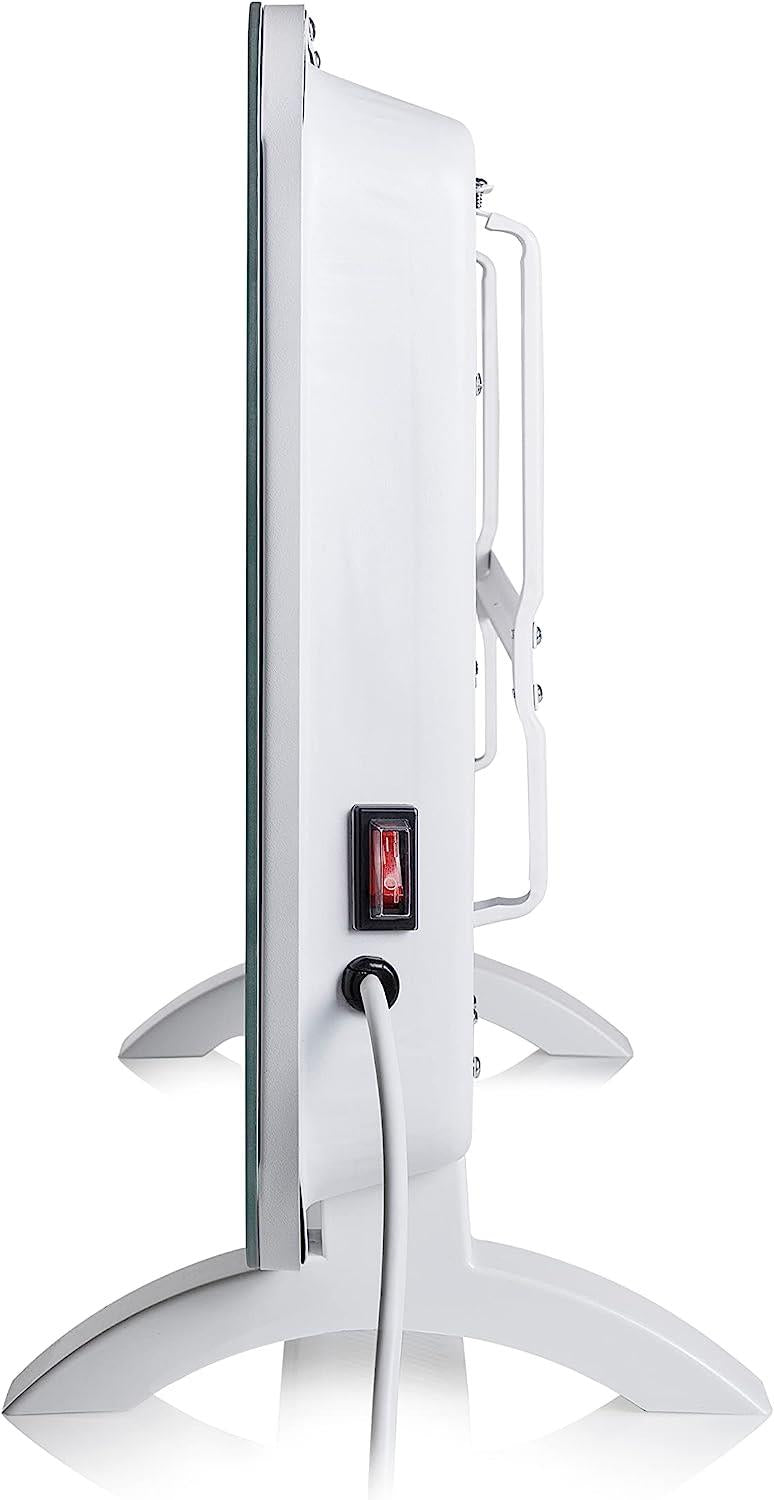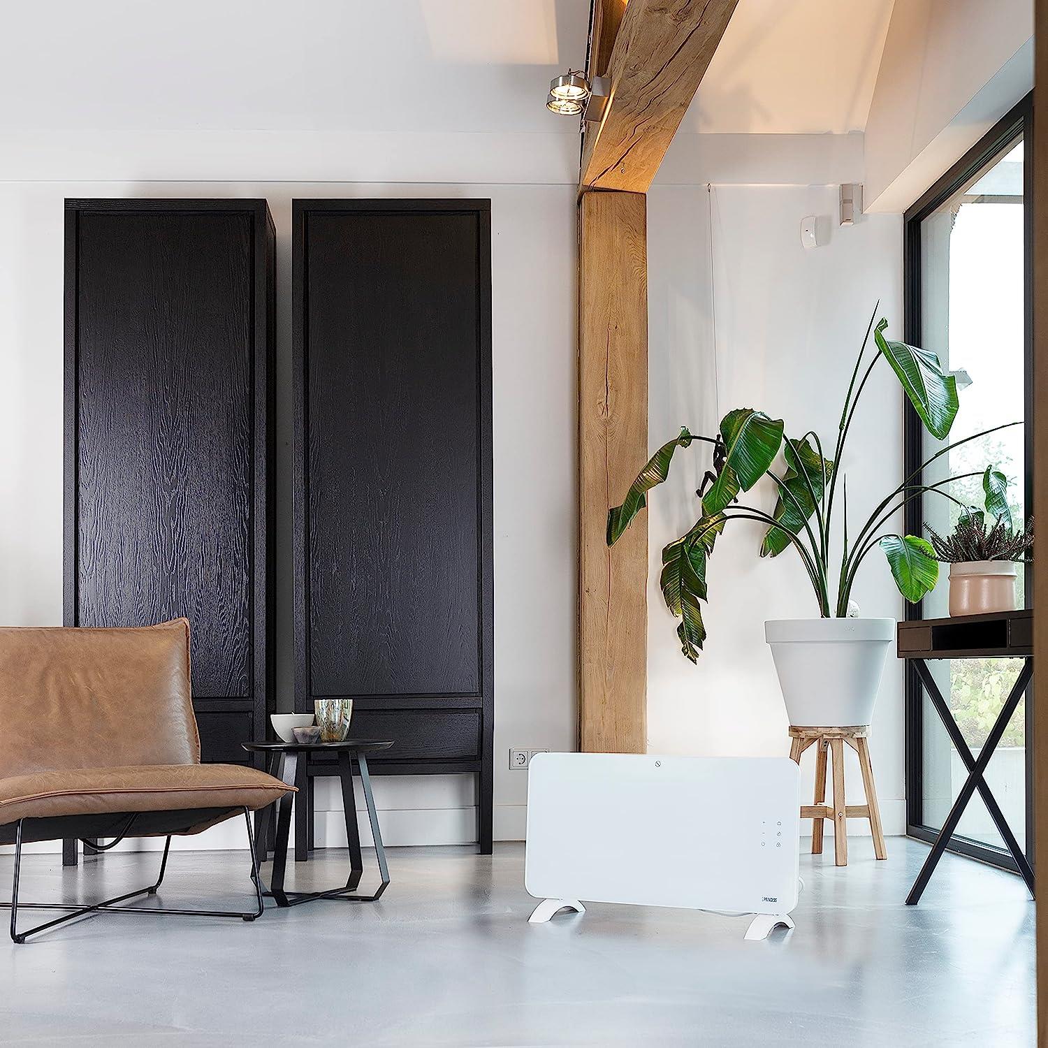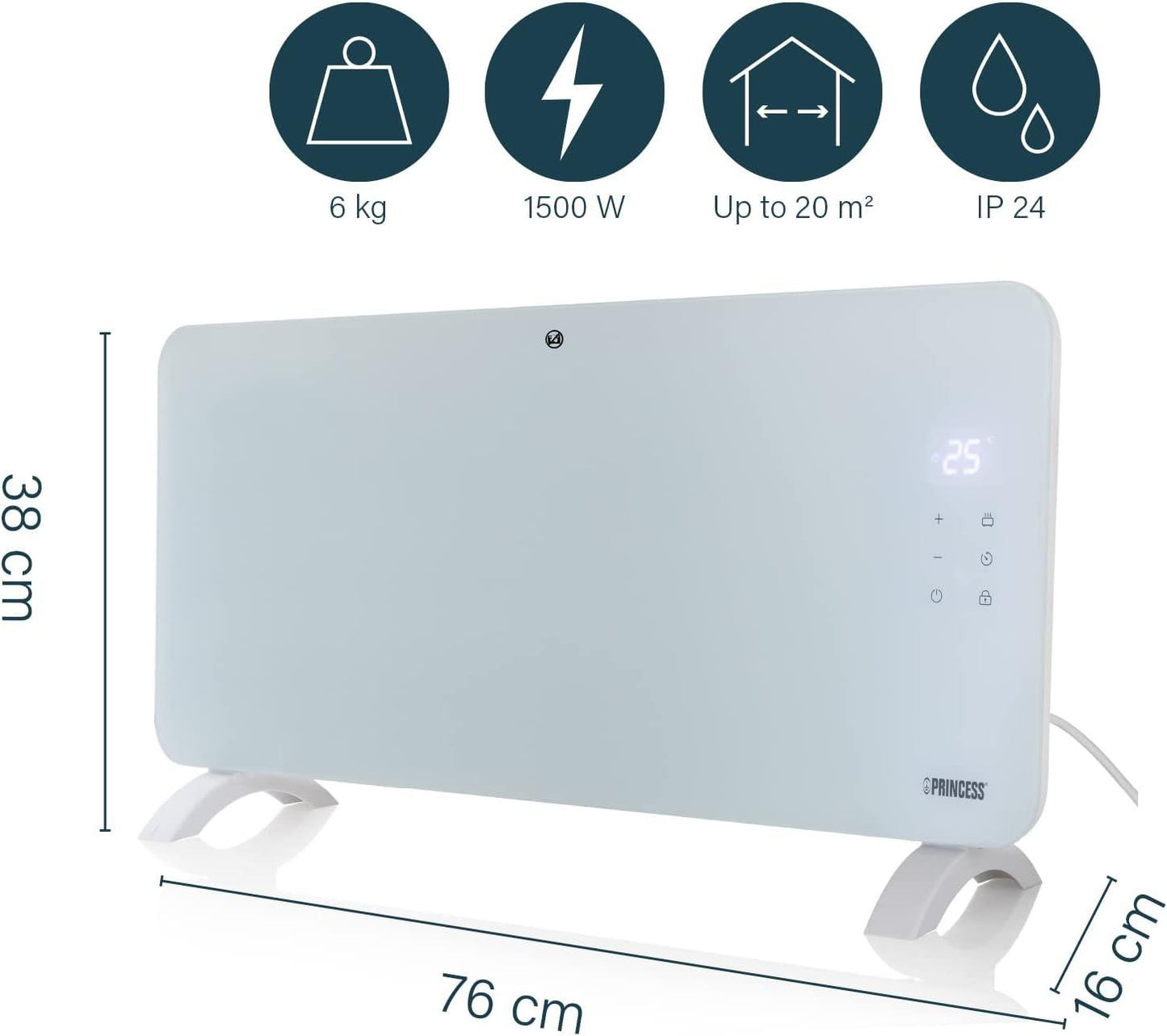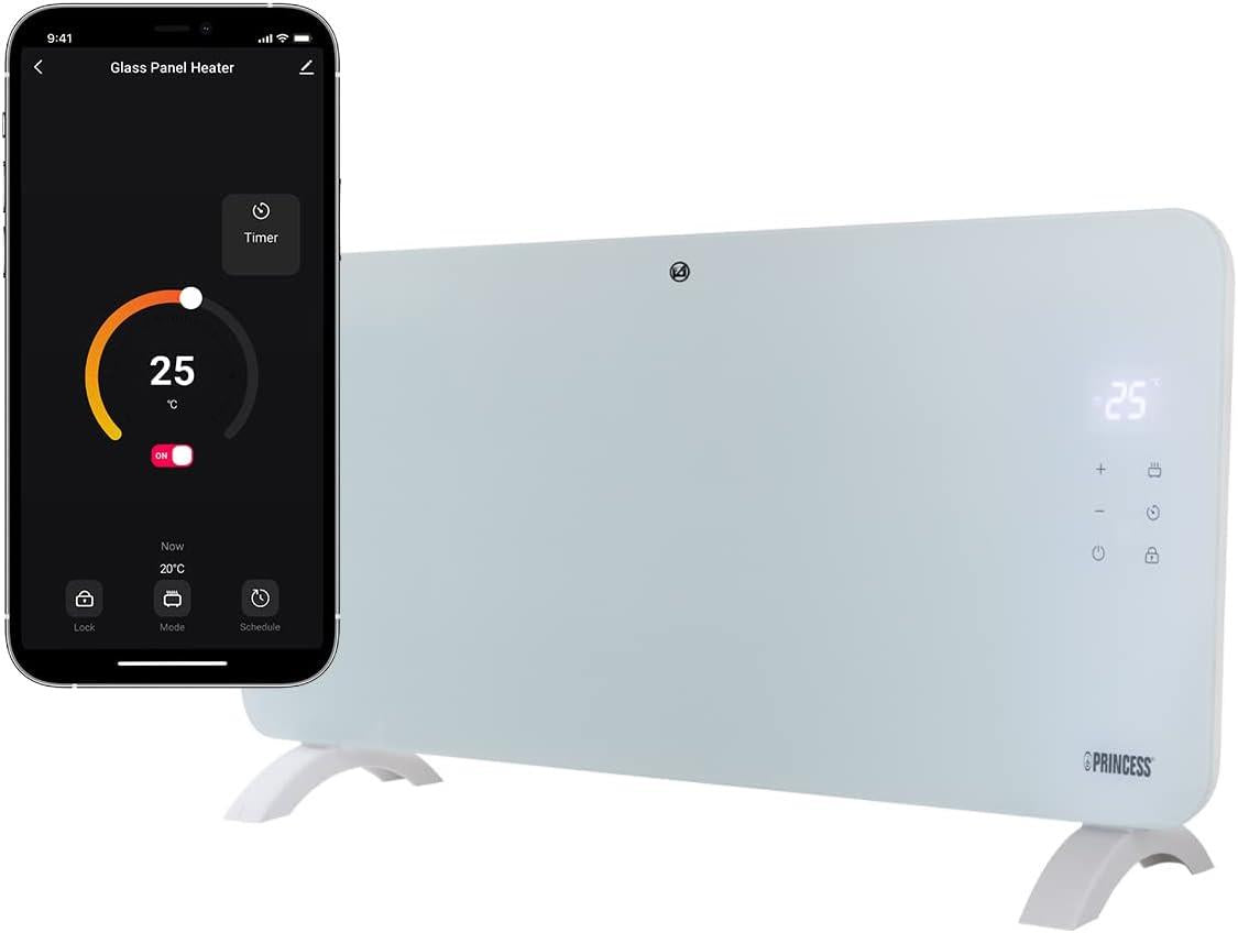 Stylish wall mountable 1500 W glass panel heater for quick and efficient heating. This heater comes with a LED touch screen, electronic thermostat, timer, child safety lock and a specially designed app for this heater. Smart Electric Panel Heater: Control your heating from anywhere in the world and come home to a warm home with the Princess Smart Panel Heater Suitable For Rooms Up To 20 m2: This Princess connected radiator is a powerful 1500 W and features two heat settings, a high and a low power and an adjustable thermostat which can be set between 15⁰C and 35⁰C. Smart Connected: With the digital display or with the free app you can turn your heater on and off, set the heating power, set schedules and timers and adjust the temperature. Free Standing or Wall Mounted: The heaters come with an included stand, or you can use it wall mounted with the included wall bracket. Ideal for use in your home office, living area or bedroom. Safe in Use: Features child safety lock and overheat protection.