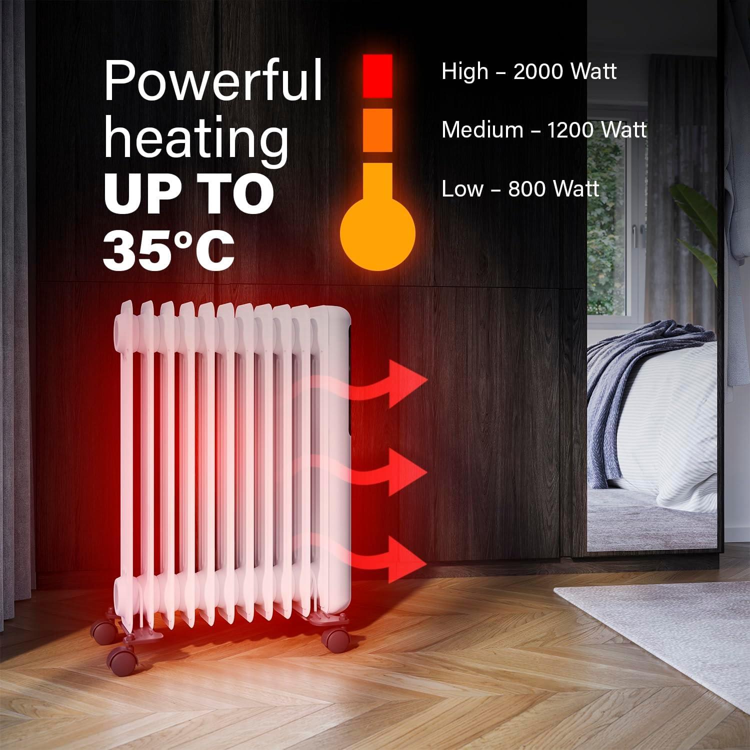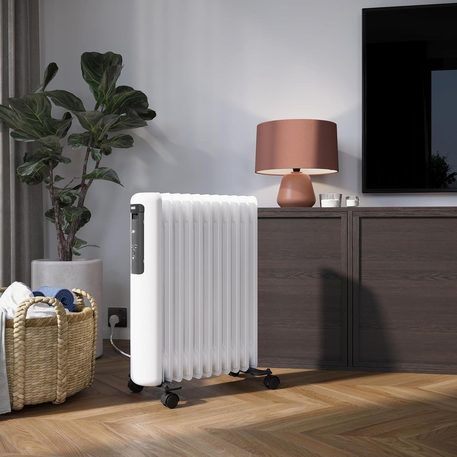 Oil-filled radiator with Wi-Fi, the oil radiator has 11 fins and multiple heat settings (800-1200-2000 Watts).