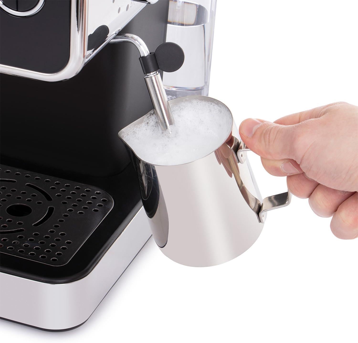 Whether you're a morning coffee drinker or you love a cup after dinner, you can enjoy a freshly brewed barista-style espresso any time you like with the Russell Hobbs Black Distinctions Espresso Machine. It has all the features you'd expect for professional coffee shop quality including 15-bar pressure, a steam/milk wand and cup warmer for 4 cups. You can control your shot measures and the quantity of coffee going into each cup. Add to these functions and features its show-off worthy distinctive design and you have everything you need to make impressive espressos at home, without the coffee house price tag. Start your day with a single or double shot of espresso in your coffee cup. This iconic punch of caffeine is the perfect wake-up call and, coming from the Russell Hobbs Distinctions Espresso Machine, you'll think it's been made by a professional barista. The number of bars on an espresso machine indicates the pressure the higher the bar, the more pressure. Generally, 15 bars is considered the optimum pressure level for good quality espresso. With a built-in thermoblock heater, the espresso machine heats up quickly for better brewing and steaming and then maintains an optimum and consistent temperature. This means your espresso won't cool down before you steam or froth the milk. Perfecto! The steam wand is the perfect tool for creating coffee-shop style cappuccino, latte, mocha and other coffee favourites.