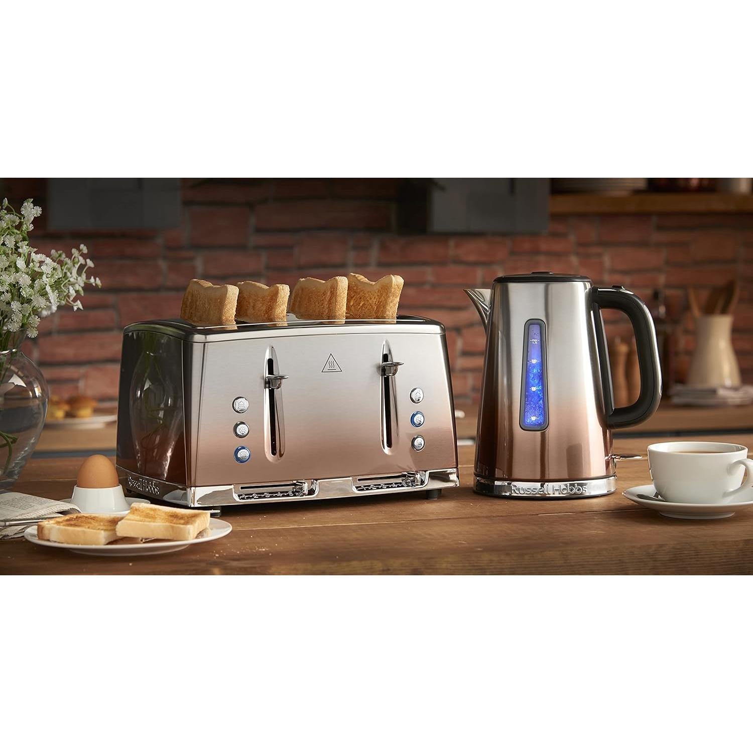 Russell Hobbs Eclipse Copper Sunset Breakfast Bundle contains a 1.7L Kettle and 4 Slice Toaster. 1.7 Litre kettle with ideal pour spout, ensuring a stable flow of water straight from kettle to cup. Up to 75 percent quieter boil. Rapid boil zone feature denoting 1/2/3 cup volume, delivers one cup of boiled water in just 45 seconds. Easy view water window with 2, 4 and 6 cup measurements, illuminates upon boil. 4 Slice toaster with extra wide slots and independent variable browning control for each 2 Slice section, meaning you can toast to your individual preference and someone else’s at the same time. 55% faster toasting to meet the demands of your daily routine and hunger when it strikes. Lift and look function enables you to check on the appearance of your toast without having to cancel and restart the cycle. Cancel, reheat, and defrost functions with high lift feature and removable crumb tray integrated into the design.