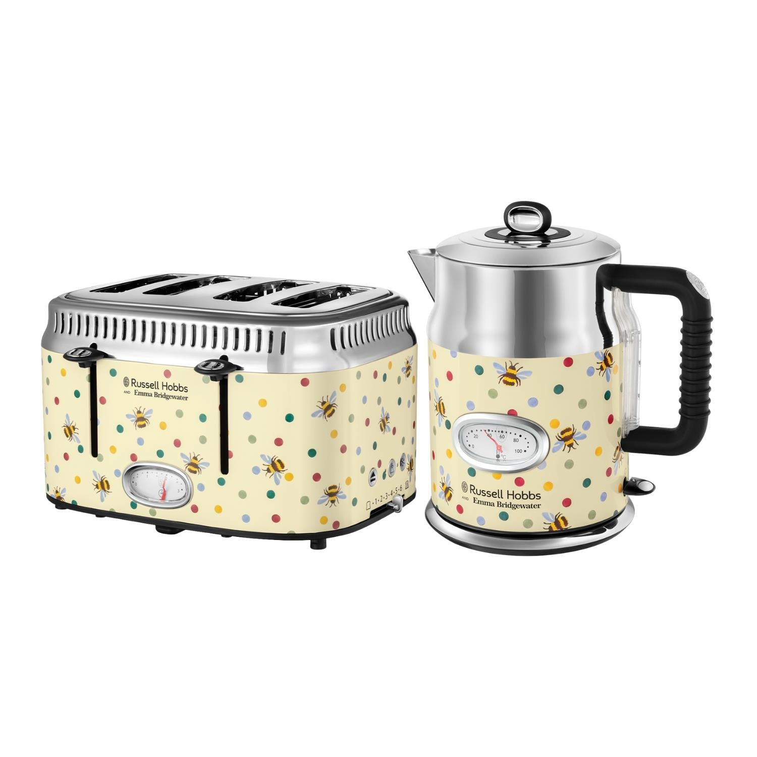 Russell Hobbs Emma Bridgewater Bumblebee Breakfast Bundle contains a 1.7L Kettle and 4 Slice Toaster. Designed in Collaboration with Emma Bridgewater - Stainless-steel kettle from the Russell Hobbs Retro Collection, with a beautiful Emma Bridgewater design. Forget messy spills and splashes on your countertop! A perfect pour spout ensures a streamlined flow from kettle to cup. Every tea lover knows that different teas require different water temperatures. The Bumblebee & Polka Dot Kettle features a charming and quirky gauge feature, so you can easily check the waters temperature during the boil. A water window and easy to see cup markers makes measuring simple, allowing you to fill the kettle with just the right amount of water you need, so you don’t waste time and energy boiling what you won’t use. Take the guesswork out of breakfast! The delightful retro toasting gauge shows the time it will take for the bread to toast. Whether you like your toast a deep golden shade or lightly toasted, with a variable browning function, you’re in complete control. Want to see how your toast is doing? Use the lift and look feature to check on the progress of your toast without stopping the cycle. 2 Year Manufacturers Guarantee - Plus 1 extra year when you register the product online within 28 days.