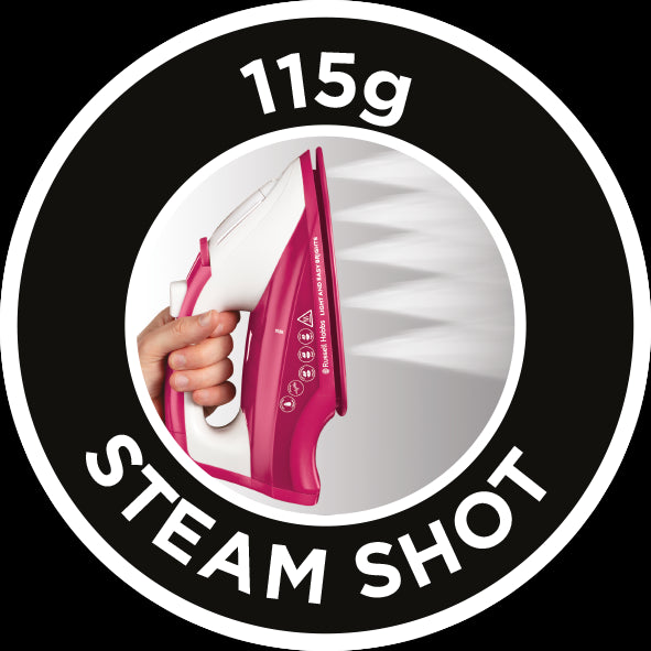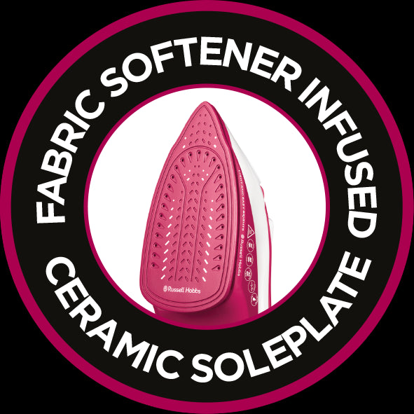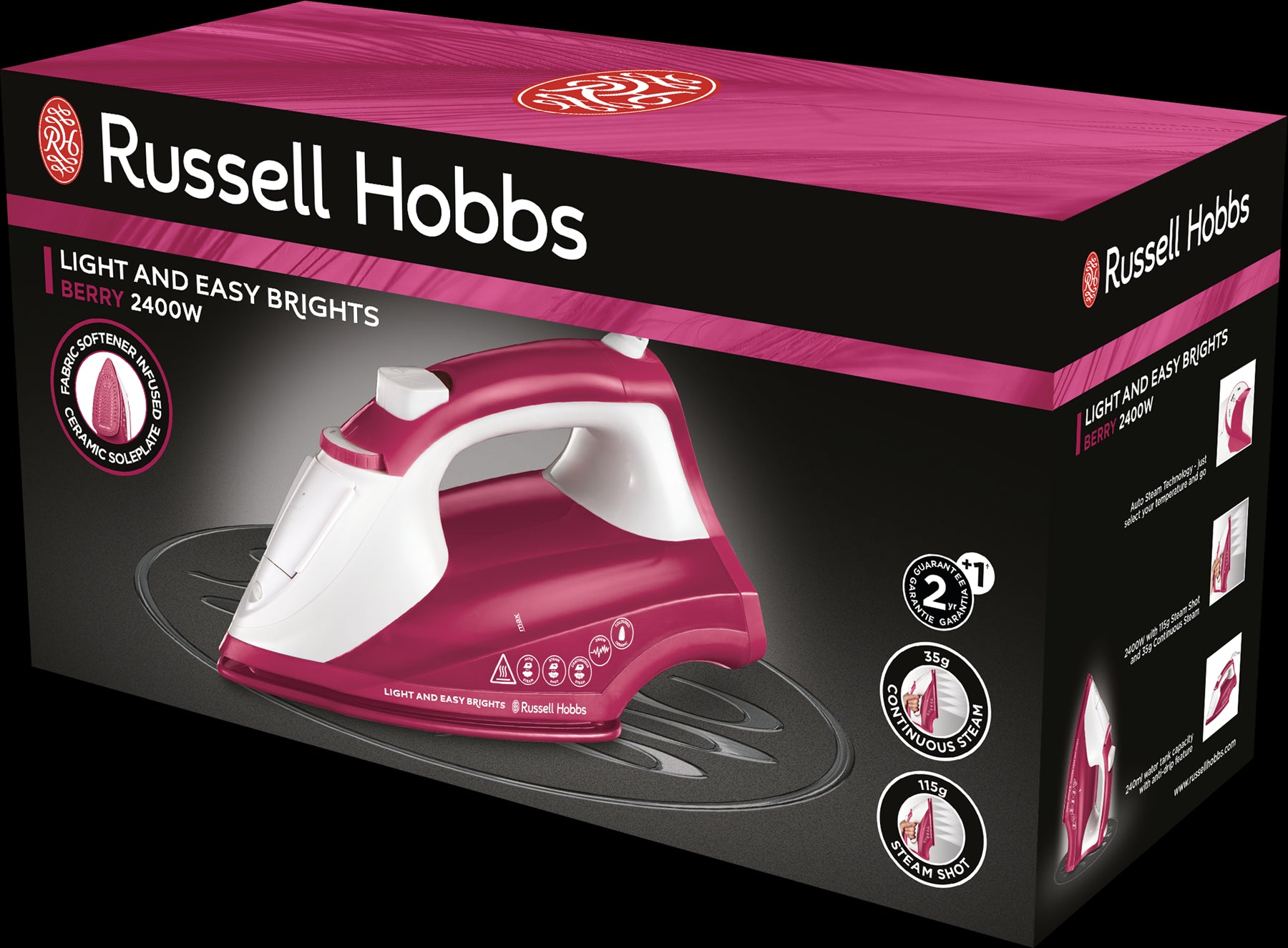 The Light and Easy Brights Berry helps you power through the ironing with ease. Effort-saving features such as a 2x more durable* ceramic soleplate with 50% smoother glide* infused with fabric softener, and an Autosteam function to take the guesswork out of steam settings. It’s also designed to deliver 115g steam shot and 35g of continuous steam to tackle tough creases with ease. *vs Russell Hobbs Standard Ceramic. Colourful Iron and Soleplate - One of our lightest iron ranges so it's easy to manoeuvre and handle. Available in a range of bold colours to enhance and brighten your ironing experience. Improved Soleplate Design - Designed with 50% smoother glide* for faster, non-stick ironing and made to be 2x more durable* for a longer working life. Fabric Softener Infused Soleplate - Fabric Softener Infused soleplate conditions fabrics while it irons and helps defend against wrinkles. Powerful Steam Output - Designed to deliver 115g steam shot and 35g of continuous steam to tackle those tough creases with ease. 2 Year Manufacturer's Guarantee - Plus 1 extra year when you register the product online.