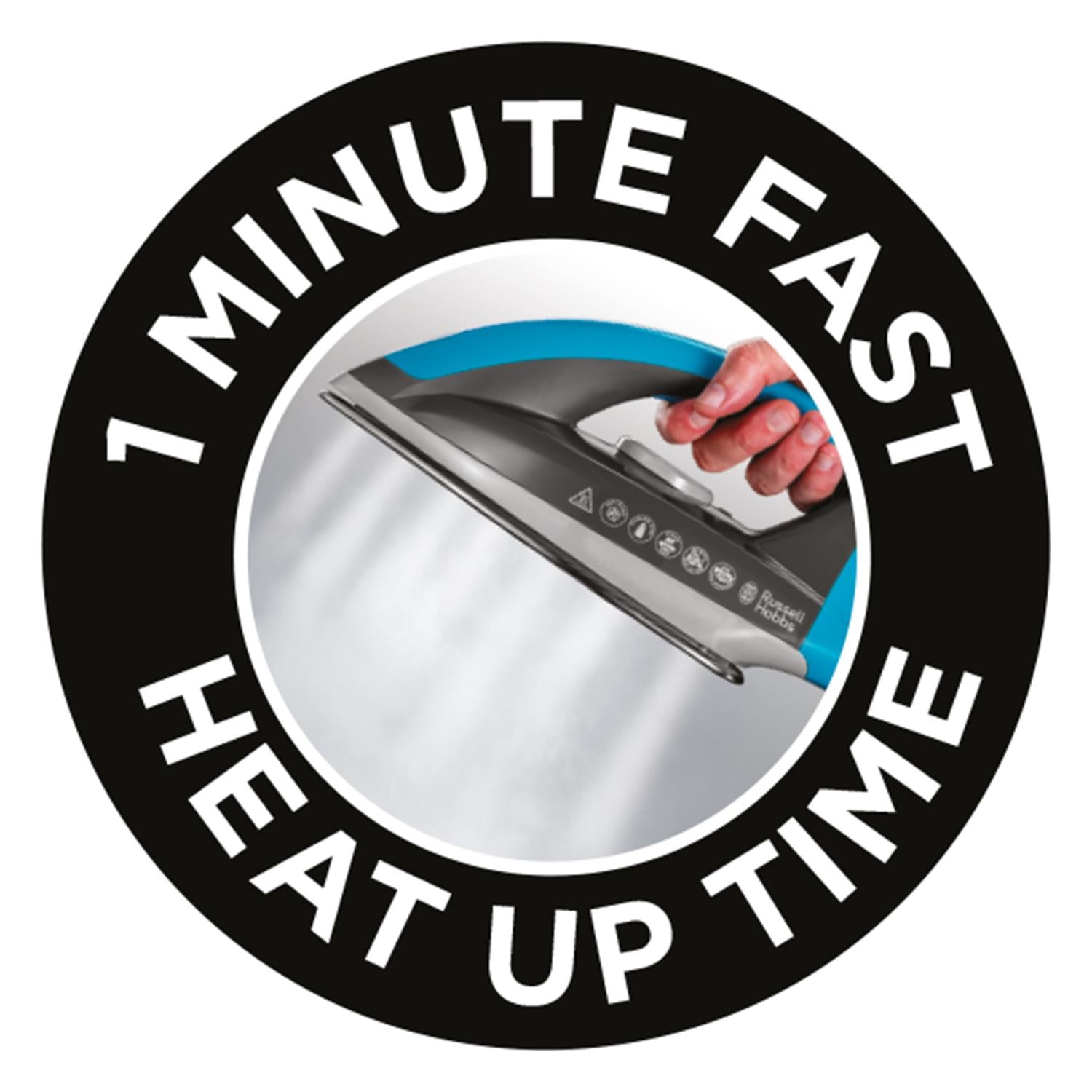 Russell Hobbs SteamPower Aqua is the ideal steam-based ironing system. It can penetrate multiple layers cutting your ironing time in half; ideal for people who like to do their ironing in one go. A stainless-steel non-stick soleplate helps to give the iron a smooth action and its powerful 4.5 bar pressure and 90g steam output make light work of the toughest creases. Its 1.3 Litre tank means you cut down on re-fills too. With a generous 4.5 bar pressure and 2400W, it powers through the largest of laundry stacks with ease. A non-stick soleplate makes your ironing routine even easier; especially when you're pressing delicate fabrics, or you need to switch up the temperature. Why wait around for your appliance to reach the right temperature when you just want to get on with it. A fast, 1-minute heat up time could take your clothes from creased to ready-to-wear in around 60-seconds.The SteamPower Aqua has an anti-calc cartridge that reduces the build-up of harmful scale and maintains a powerful steam performance, prolonging the life of your appliance. For heavy-duty ironing, get steam on your team.