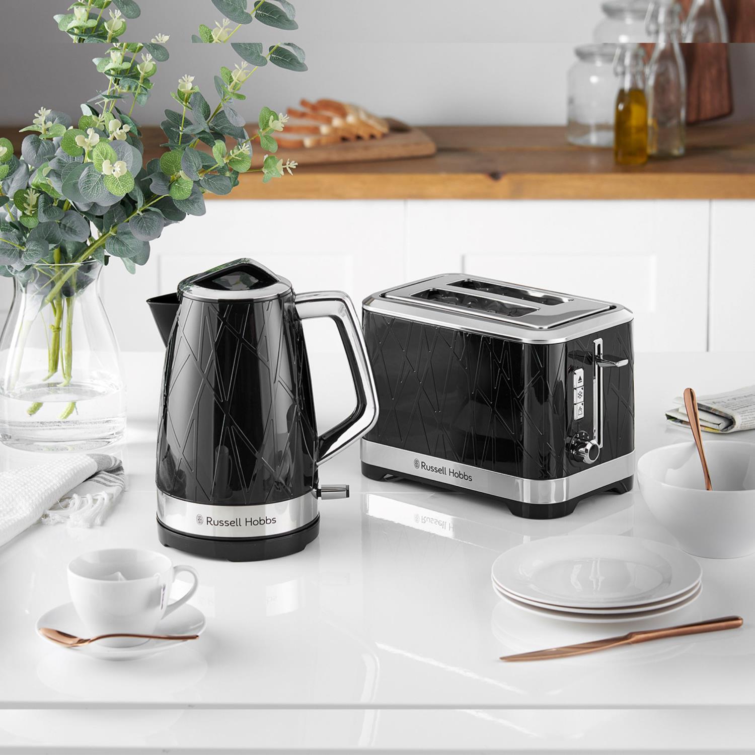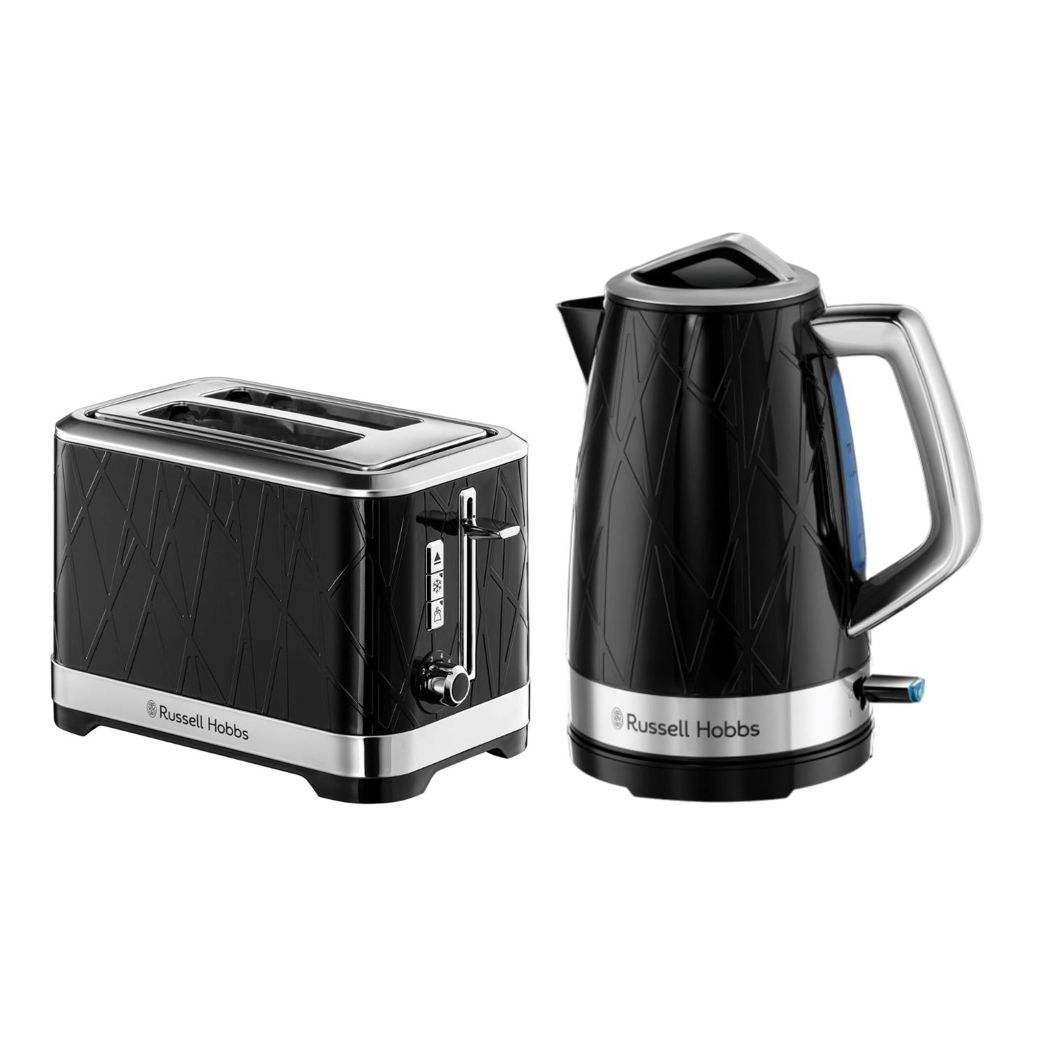 Russell Hobbs Structure Black Breakfast Bundle contains a 1.7L Kettle and 2 Slice Toaster. Statement Design That Lasts - Looking for a premium kettle that’s striking in appearance and built to last? Then you’ll love the Structure Black Kettle. Internal Blue Illumination - Brightening up your kitchen with every boil, this illumination not only looks striking, but always lets you know when your kettle is on and boiling. Rapid Boil - Thanks to the Rapid Boil Zone Markers, you can Boil One Cup (235ml) in 45-Seconds and Save up to 65 percent Energy when boiling one cup vs 1 litre. Other Features Include; Water Window, Boil Dry Protection, Perfect Pour Spout and 360 degree Base with Cord Storage. Statement Design That Lasts - Searching for a toaster that combines style and substance? Look no further than the Structure Black 2 Slice Toaster. Lift and Look - Want a sneak peek at how your bread is toasting? Simply lift, check on the toast, then place back down, all without breaking the cycle. Variable Browning Control - Whether you love a light, golden slice or need a bronzed, darker slice to really satisfy your toast cravings – this toaster lets you do it all. Frozen, Reheat and Cancel Functions - Toast a slice straight out of the freezer, reheat that slice you’d forgotten about, or click cancel to stop the toasting cycle. 2 Year Manufactures Guarantee - Plus 1 extra year when you register the product online.