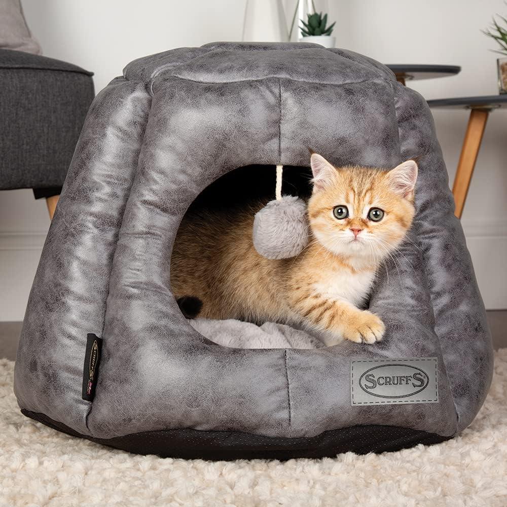 Scruffs® Knightsbridge Collection provides an opulent environment for your pet to relax. Featuring an antique, eco-leather fabric with a deep-filled 100% polyester centre to ensure your pet remains as comfortable as can be. The matching outer stitching achieves a coherent finish and detailing across each bed. Scruffs® Knightsbridge Cat Bed provides a safe and comforting environment for your feline friend, with its eco- leather design, roofed exterior and super-soft, deep-plush fabric. The attached string toy will offer hours of endless entertainment. The inner cushion only can be machine washed at 30 degrees.