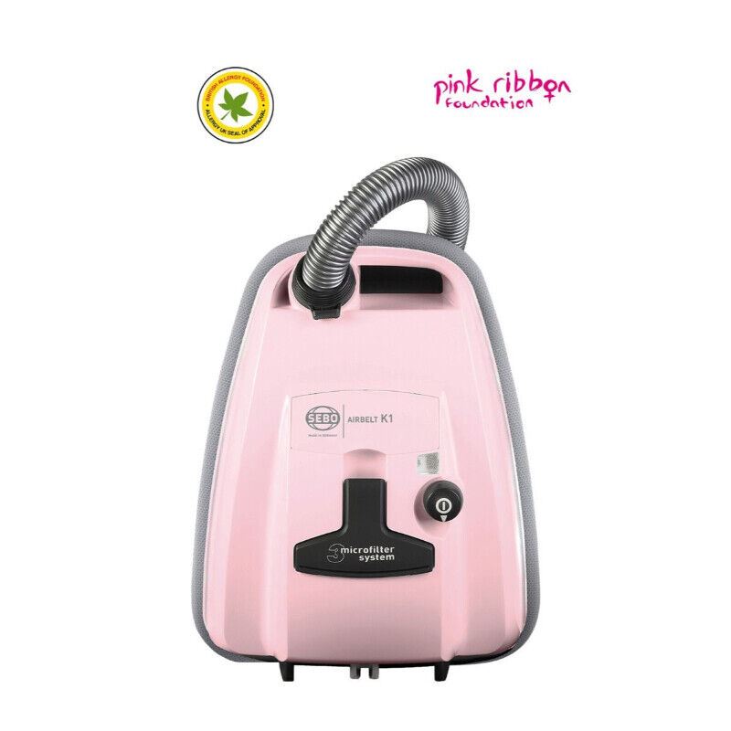 The SEBO AIRBELT K1 Pastel Pink is a great all-round vacuum cleaner. The ergonomic handle grip and its light weight make it comfortable to use, whilst the soft airbelt bumper system protects walls and furniture. Featuring a powerful 890W motor and a comprehensive range of tools, the AIRBELT K1 Pastel Pink is suitable for all floors. With multi-stage microfiltration and SEBO Ultra-Bags, their anti-allergy design has British Allergy Foundation Approval. *SEBO is proud to be supporting the Pink Ribbon Foundation with the fabulous and stylish K1 Pastel Pink. 25% of all K1 Pastel Pink profits will be donated by SEBO (UK) Ltd directly to the charity to help in the fight against Breast Cancer. The SEBO AIRBELT K1 ePower range of vacuum cleaners are compact, yet durable and powerful, helping you make light work of housework. The intelligent design shows in every aspect of the K models. Comfortable handle grips for easy manoeuvring, a soft airbelt bumper system to protect your furniture, together with many other details, create a vacuum cleaner that works with you, and your home. Powerful airflow, professional cleaning heads and a highly efficient filtration system combine to give outstanding cleaning performance on any type of floor and for any size home. Made in Germany, SEBO vacuum cleaners are constructed from the highest quality materials. Every SEBO vacuum cleaner is fully tested before it leaves the factory so that you can be confident that in buying a SEBO, you are buying the best. The AIRBELT K1 Pastel Pink comes with six useful and easy to use attachments: Floor Turbo Brush Pro; Comfort Pro Kombi Head; SEBO Twin Care Extra Wide Hard Floor Head with XL Integrated Upholstery Nozzle; Dusting Brush with Clamp; Upholstery Nozzle and a Crevice Nozzle.