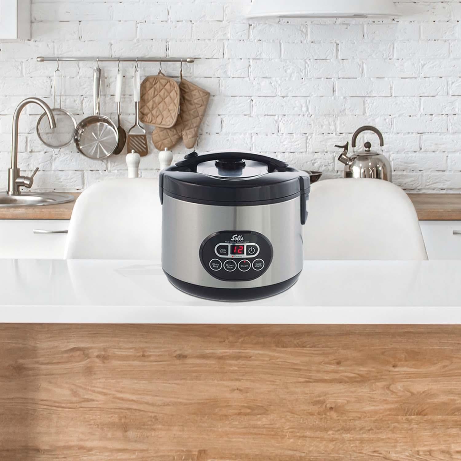 One appliance for cooking rice and steaming vegetables, fish and poultry. With the Solis Rice Cooker Duo Program, both can be done even at the same time. Savoury or sweet rice, saffron rice, quinoa, rice for risotto, jasmine, basmati and wild rice. Solis has mastered the art of cooking perfect, fluffy rice while allowing to steam vegetables, fish and poultry simultaneously, saving energy, space and time. The cooking process is taking place fully automatic: Start the cooking process by selecting the desired program. This kitchen aid is able to produce up to 12 cups of cooked rice at a time. The even heat distribution and non-stick coating of the bowl ensure evenly cooked rice without sticking. The cooking process ends automatically and the rice cooker switches to keep-warm mode for as long as 10 hours before the appliance switches off automatically. A practical delay timer function lets you set a countdown from 1 to 15 hours after which you want the rice to be cooked. This means that you could add rice and water to the rice cooker in the morning, to have deliciously cooked rice waiting for you when you come home in the evening. With an additional steaming function, fresh and frozen vegetables, fish, poultry, seafood and even other food such as dumplings can be prepared easily while preserving nutrients and vitamins. When pressing the steam button repeatedly, the steaming time can be increased in steps of one minute up to a maximum steaming time of 30 minutes. Thanks to its non-stick coating, the cooking bowl can be easily cleaned with warm, soapy water. The stainless-steel steaming insert is even suitable for cleaning in the dishwasher. Simply clean the rest of the appliance with a damp cloth and you are already done. The only thing you need to do is to sit back and enjoy your freshly cooked, healthy meal!