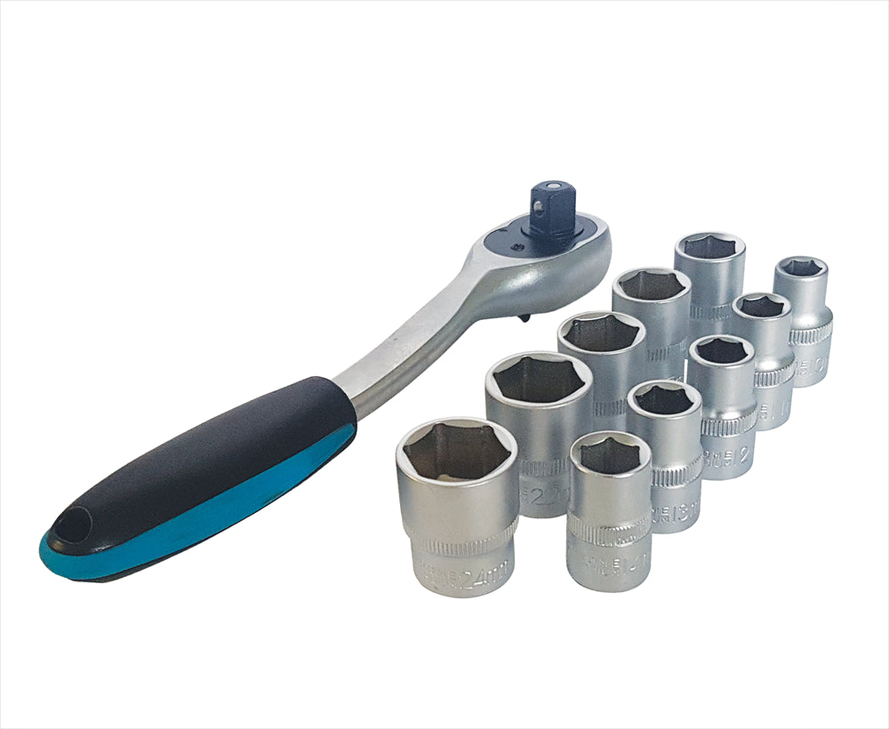 A chrome vanadium steel 1/2” ratchet driver socket set that comes with 10 different-sized sockets.