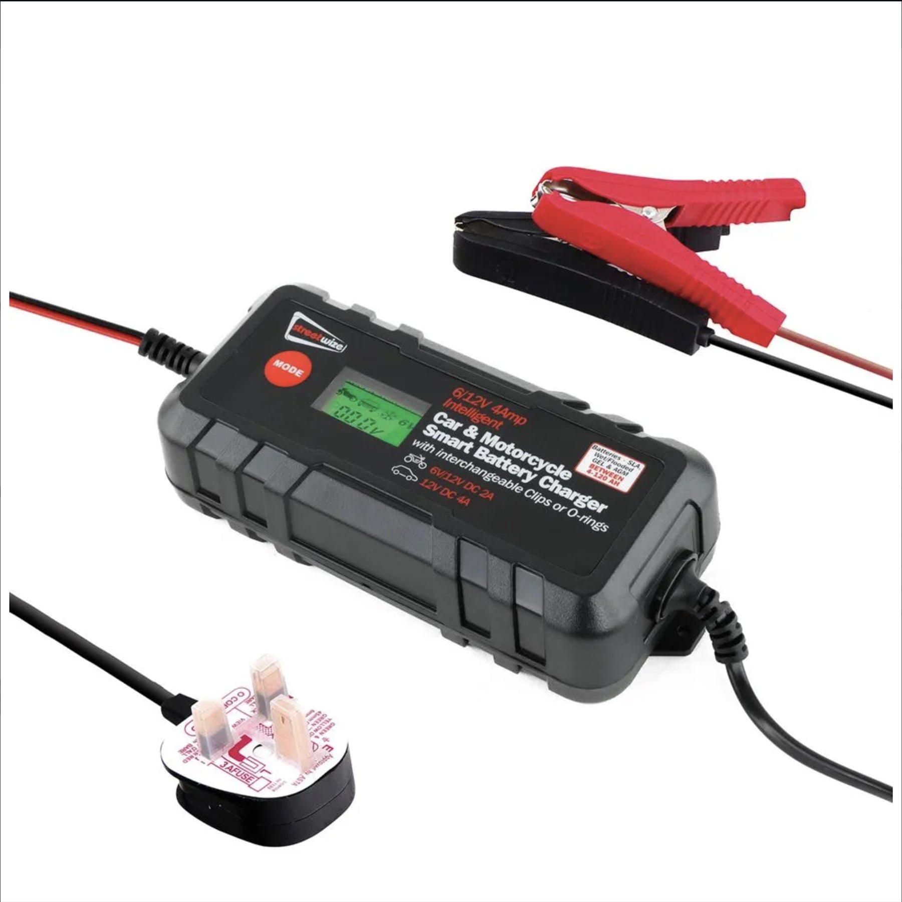 This smart charger can charge both 6V and 12V batteries at a maximum charge power of 4 Amps. This charger has a unique microprocessor which monitors the battery level so that it adjusts the charge power, preventing the battery from getting overcharged. This smart charger follows a three-step process: Bulk Charge: If the battery charge level is low or flat, the battery charger will provide its maximum charge power; Absorption: Once the battery level is at 80%, charge power is reduced to the point where the battery is absorbing a steady charge; Float: The charge power is further reduced to a slow trickle charge when the battery level is at 95%. When the battery level is nearly full, and the battery is still connected to the charger, the charger will automatically keep the battery full without overcharging it. The charger features a LCD display that shows the current charge level. It also features four charge modes: car, motorcycle, trickle and winter. The winter charge mode is for charging the battery during cold conditions when more charge power is required. The trickle charge provides a slow charge for maintaining and optimising the battery level. Suitable for SLA [Sealed Lead Acid], Wet/Flooded [Liquid Electrolyte], GEL, AGM & MF. An intelligent battery charger that follows a three step process. For use with Car, 4x4, Van, Motorcycle, Caravan/Motorhome, Leisure & Marine Batteries. Ideal for vehicles in storage. Four charge modes: car, motorcycle, trickle & winter. Short-Circuit Protection. Reverse Polarity Protection. 6V/12V 4 Amp. Battery capacity compatibility: 3 to 120 AH.