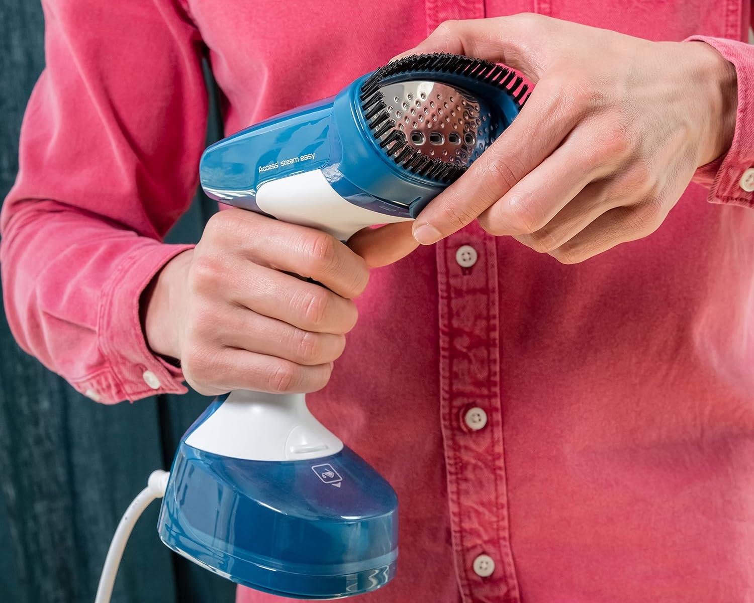 Got creases? Refresh clothes quickly and easily with the Tefal Access Steam Easy handheld clothes steamer. Designed for an easy life, this 1400W clothes steamer blasts out 25g of steam a minute plenty of power for some seriously speedy crease removal. And its ready to use in just 15 seconds. Handy if you spot a crease as you head out the door. No waiting and no ironing board. This Tefal steamer includes a nifty door hook for convenient steaming anywhere. Just pop it over a door, hang up your clothes, and steam away. It's also got an extra-long 2.6m power cord handy when plug sockets are few and far between. You can use Access Steam Easy safely on all sorts of garments, even delicate ones. Like that tricky-to-iron silk blouse at the back of your wardrobe. It also comes with a gentle microfibre brush for treating sensitive fabrics and removing dust, so your outfits always look their best. Not just an expert at smoothing out creases, this handheld steamer also sanitises as it steams. The natural purifying power of steam kills 99.99% of viruses, bacteria, and germs*, and reduces odours. It's great for freshening up outfits between washes, and keeping soft furnishings, like rugs and curtains, germ free. (That extra-long cord will come in especially handy for this.) Built to last, Access Steam Easy is backed by Tefal's 15-year repairability commitment.
