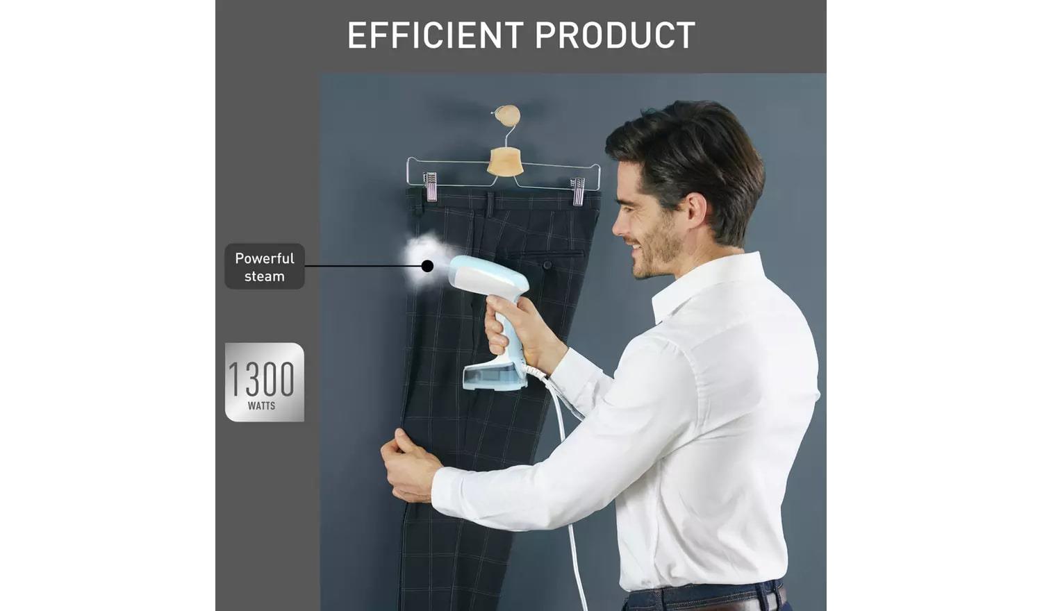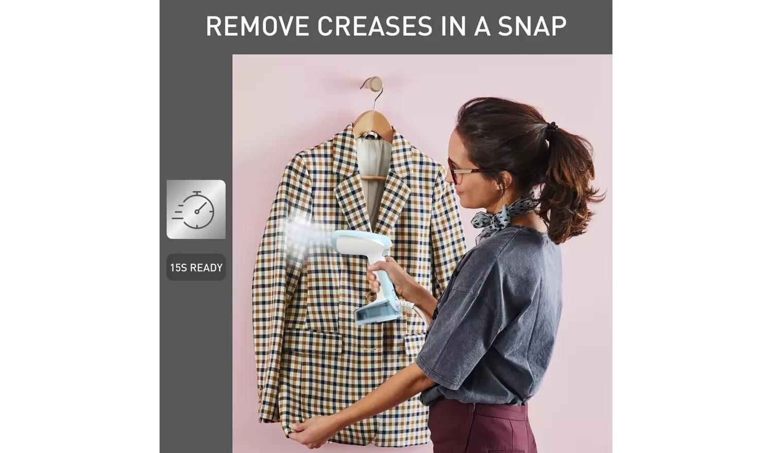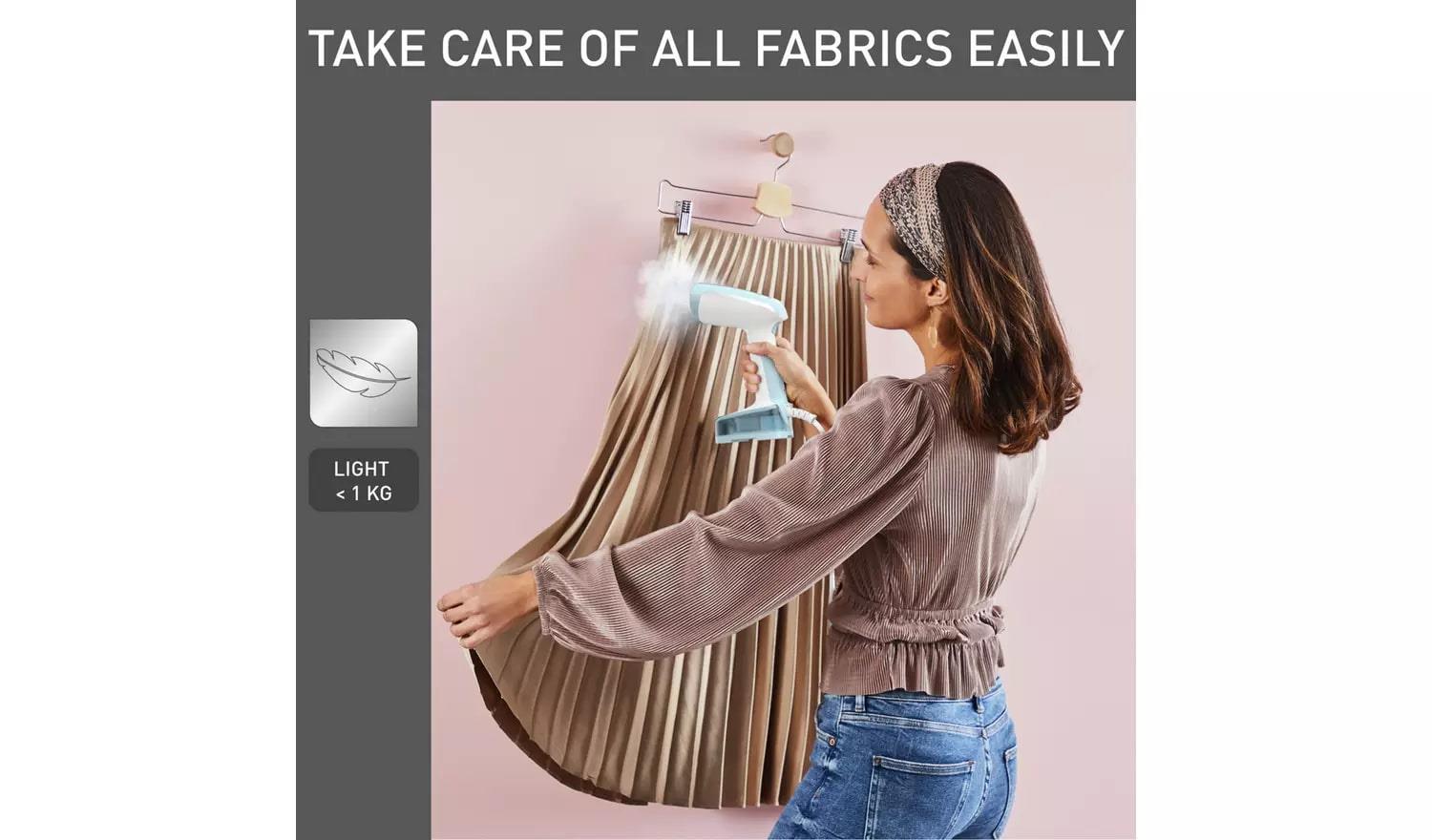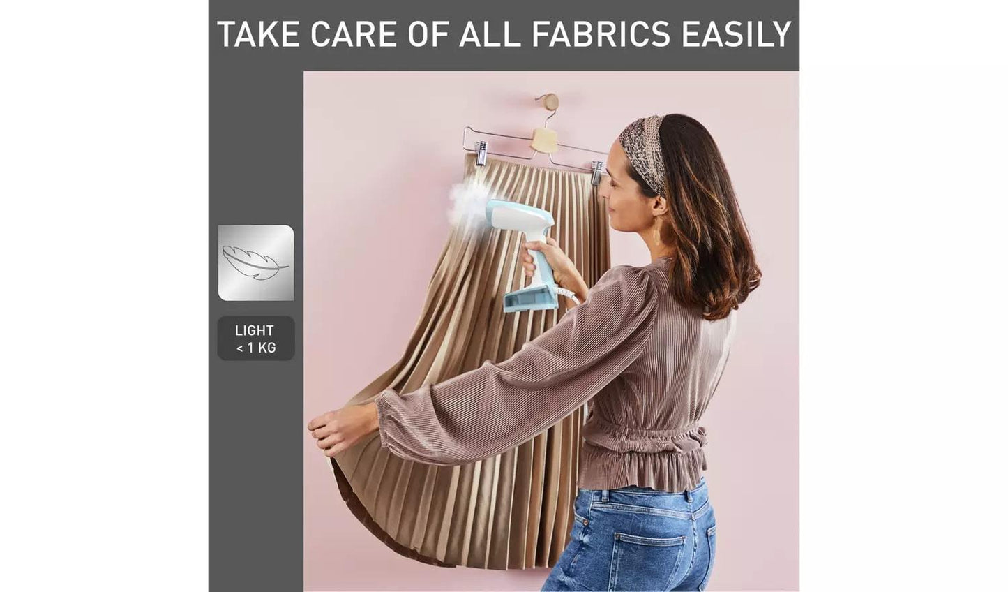 Keep your clothes looking tip-top at home or away with the sky-blue Access Steam Pocket, Tefal's compact handheld clothes steamer. A must-have for travellers, Access Steam Pocket boasts a clever foldable head so it'll fit in any bag (or cupboard) with ease. Plus, it's super lightweight which, as well as making the most of your baggage allowance, means it's a joy to use. Late for dinner? This 1300W steamer heats up in just 15 seconds and produces 20g/min steam to blast away creases fast. So, you can get your outfit ready and still make that table reservation. You'll also avoid the faff of setting up the ironing board, and a steamer takes up far less space, a major plus in cramped hotel rooms. This Tefal steamer stands up on its own, turns itself off, and only releases steam when you press the trigger. And it's safe to use on all kinds of fabrics even silk. What's more, the natural power of steam kills 99.99% of viruses, bacteria, and germs, and reduces odours. Leaving your clothes feeling fresh, clean, and ready to wear again. Great if you've packed light. Access Steam Pocket is backed by Tefal's 15-year repairability commitment, so you know this one's in it for the long haul. (We don't just mean flights.)