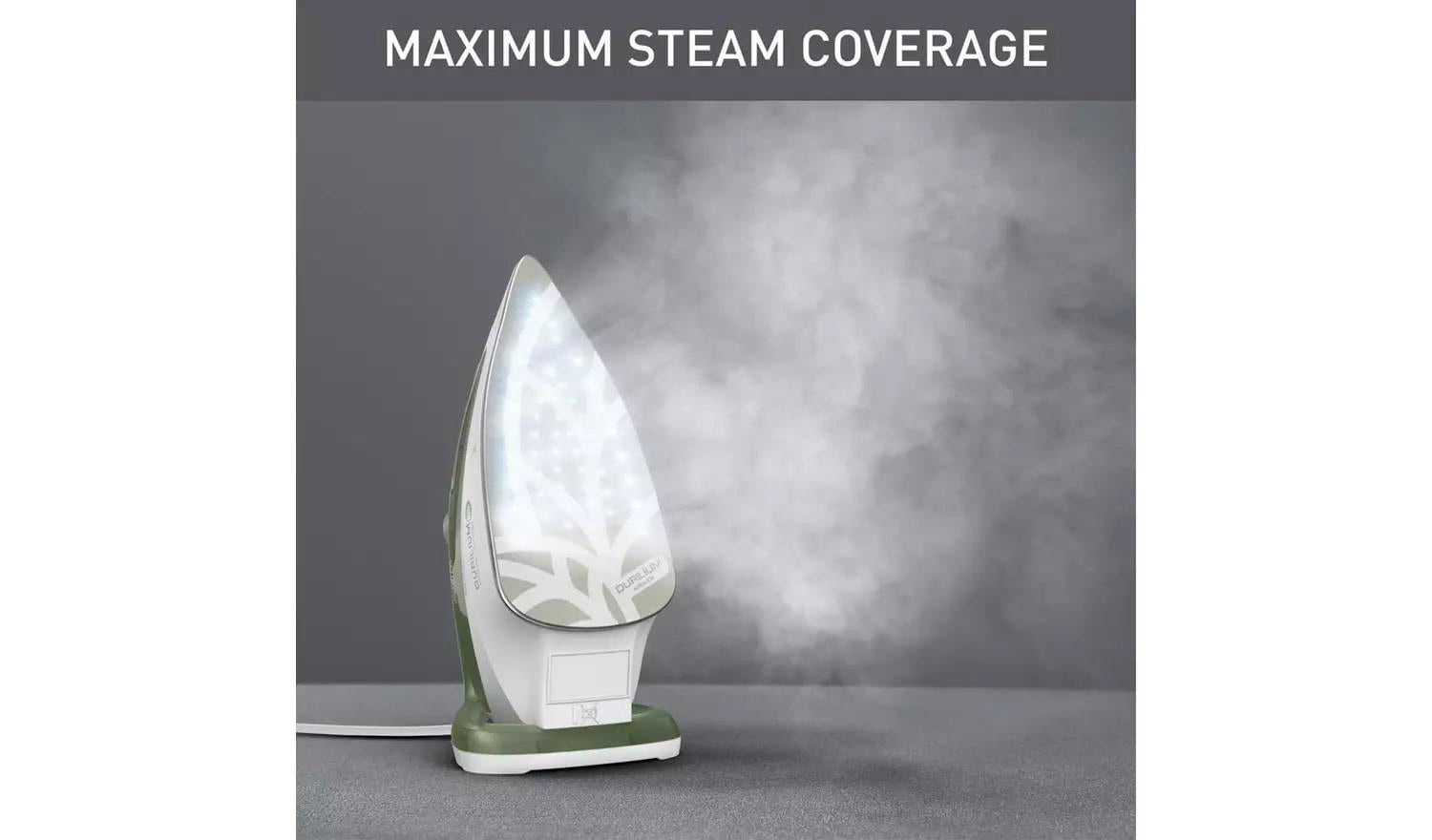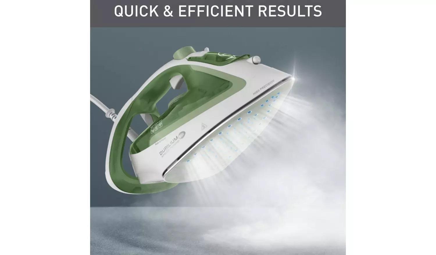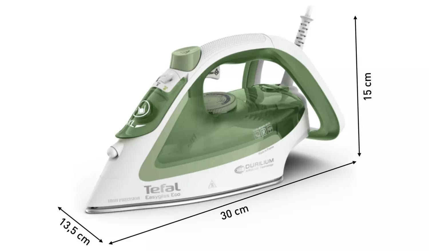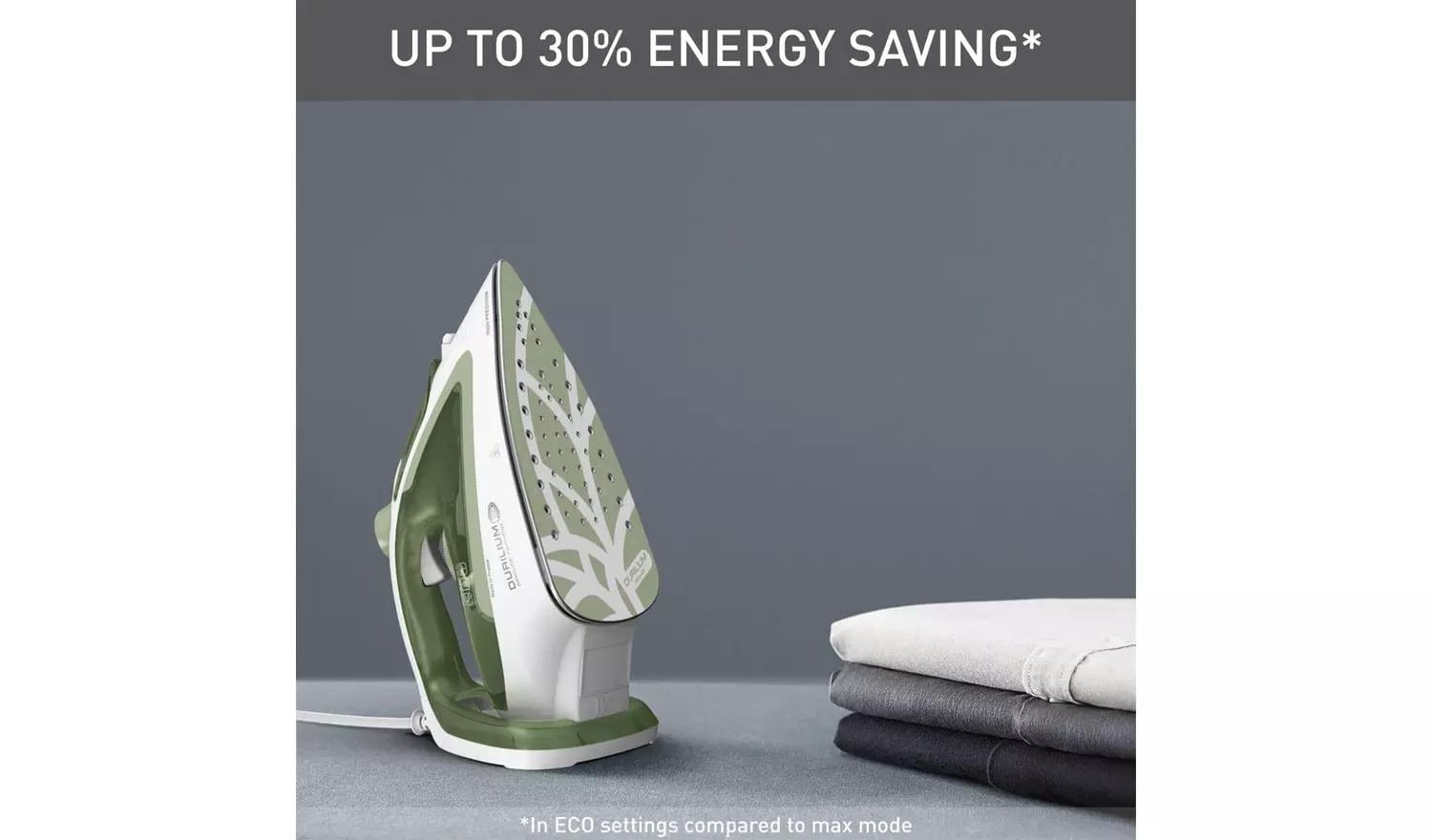 Looking to reduce your environmental impact without compromising on clothes care? Meet Easygliss Eco, Tefal's first eco-designed steam iron. Green in colour and by design, this Tefal steam iron has an efficient Eco mode that saves power when you don't need as much steam. Like when you're ironing a delicate blouse or just have a few creases to smooth out. Eco mode gives you 100% ironing performance using up to 30% less energy1. Now that's good news for the planet and for your pocket! Easygliss Eco is made from up to 35% recycled materials and it's 88% recyclable. Even the box is 93% recycled fibres (cardboard), 0% plastic, and 100% recyclable, as part of Tefal's commitment to sustainable design. This sustainability is matched by performance. A 2800W powerhouse, this iron heats up in a flash and pumps out 50g of steam a minute to banish creases fast. It's also got a 260g/min boost that makes speedy work of stubborn creases. And who doesn't want quicker ironing sessions? Ironing won't feel like a chore with Tefal's best-gliding, new Durilium Airglide soleplate, complete with distinctive green leaf motif. 100% active steam holes leave creases nowhere to hide. It's scratch resistant too, to keep it running smoothly day after day (see what we did there?). Plus, its precision tip takes the bother out of ironing between buttons. Manufactured in France to uncompromising standards, Easygliss Eco is designed to be repairable for 15 years In Eco mode compared to Max mode.