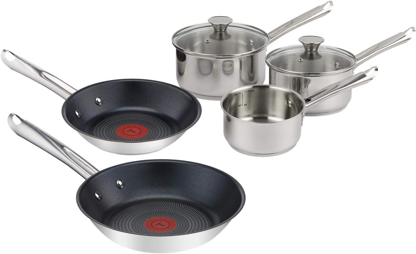 Elementary five-piece set, 14 cm milk pan, 16/18 cm saucepans with lids and 20/24 cm frying pans. Useful features include non-stick coating and Thermospot technology. Oven and dishwasher safe for added convenience. Includes two saucepans and one milk pan, as well as glass lids so you can keep an eye on your cooking; two frying pans complete the set to give you a versatile selection for your kitchen needs. The saucepans have internal measuring marks within the pan, helping you be precise in your measurements when adding liquids to your cooking. Introducing Tefal Elementary 5-Piece set: the ideal stainless steel starter set for durable cooking performance. Our Thermo-Spot heat indicator (on every frying pan) turns solid red when the pan is at exactly the right temperature to start cooking (between 180-200C). Your food will glide off thanks to the non-stick Powerglide coating. Reinforced with mineral particles, this ultra-resistant coating protects against scratches too, so you can be sure your pans will last. This set is made from high quality stainless steel (18/10 grade) which makes it the ideal material for cookware thanks to its durability. Stainless steel is considered a hard wearing material and meets the most demanding industry requirements thanks to its resistance to corrosion, stains and shocks. It also feature a 5 year guarantee. The pans are a breeze to clean by hand or in the dishwasher and are compatible with any hob, including induction. The handles are also oven safe, so you can start cooking dishes on the hob and finish them off safely in the oven. Vented glass lids* let you monitor cooking progress and excess steam to escape no need to lift the lid! Box Contains: 1 x Elementary 5 Piece Stainless Steel Pan Set (14CM MILK PAN, 16/18CM SAUCEPANS WITH LIDS & 20/24CM FRYING PANS).