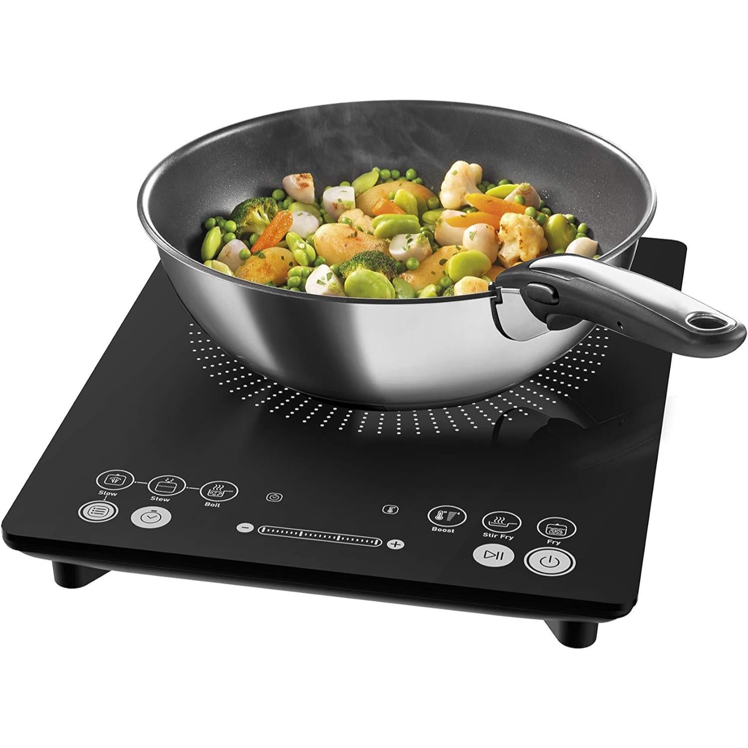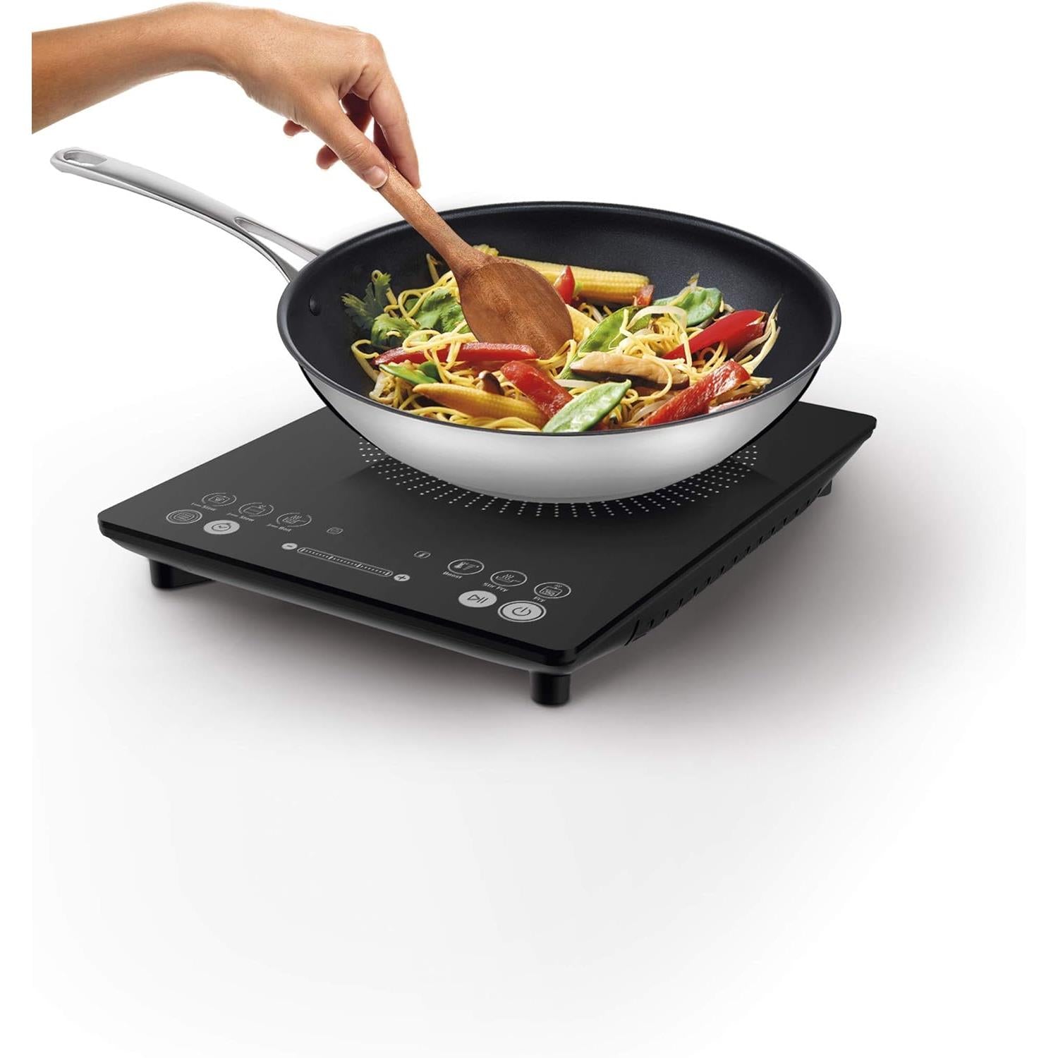 Everyday Slim is ideal for smaller kitchens or when you need an extra cooking zone. At only 45mm slim, it fits into tight spaces for storage. Six functions, from slow cook to searing to ensure perfect results with ease. The manual option puts seven power levels from 300W to 2100W at your fingertips for high-precision cooking. Everyday Slim has touch-sensitive controls and a clear digital display, a built-in timer, plus handy pause function, and is suitable for induction hob pans measuring 12m to 26cm in diameter. With induction cooking, there are no open flames to burn fingers and only the pan is heated, so it's more energy efficient. For extra peace of mind, the hob turns off5 minutes when not in use. Built to last in scratch-resistant black ceramic, the Everyday Slim induction hob looks smart and is easy to clean.