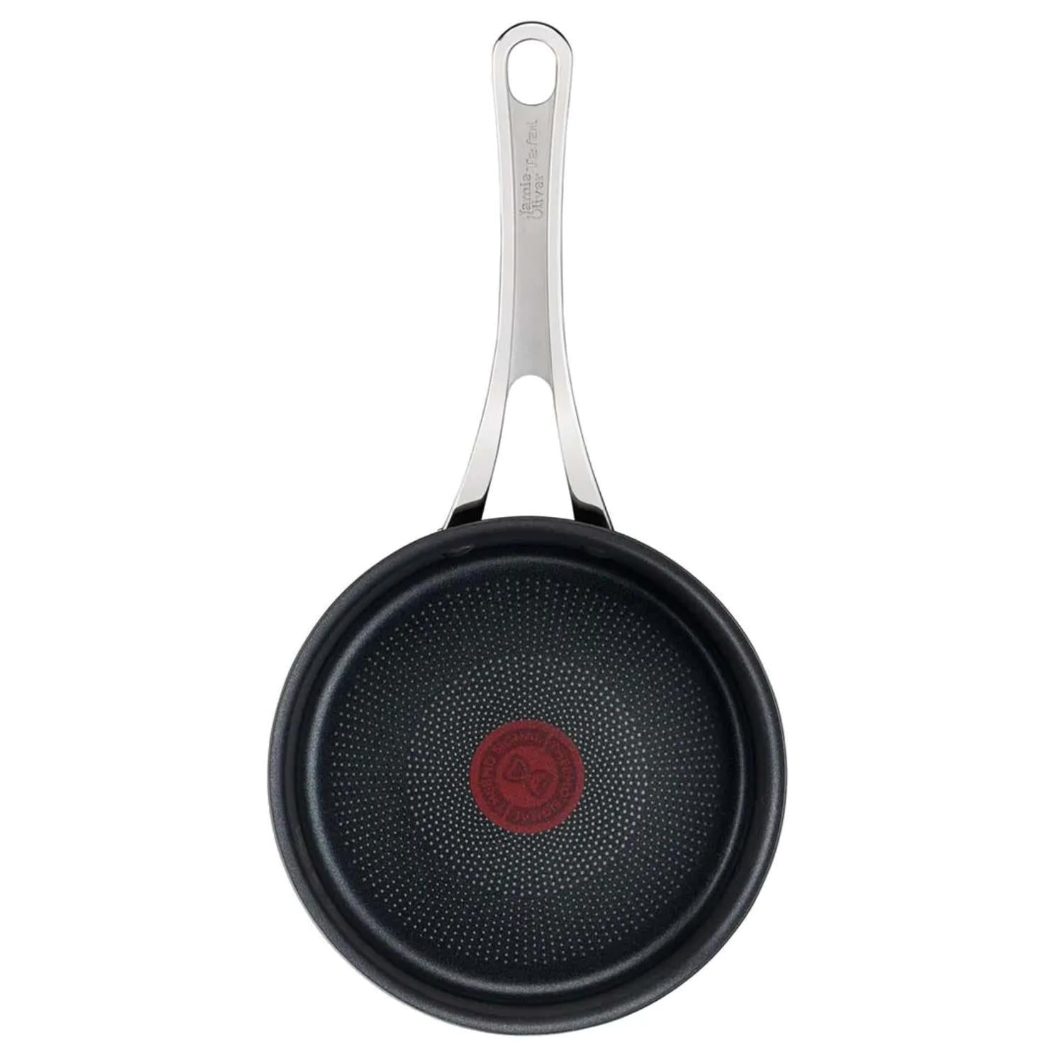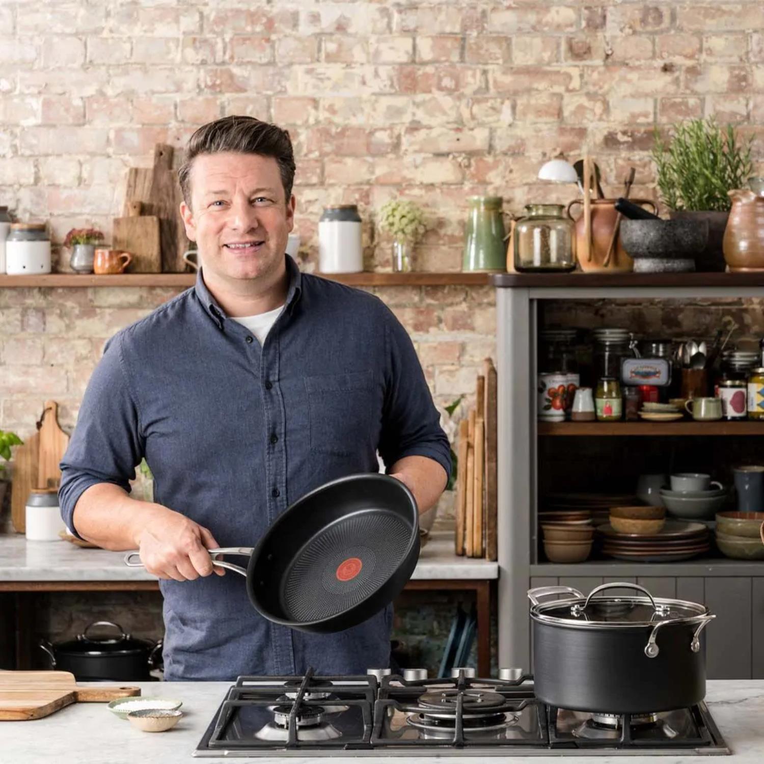 Take cooking to the next level with the new Jamie Oliver by Tefal Cook’s Classics range. Expertly crafted from tough hard anodised aluminium, this premium cookware is designed for a lifetime of professional-style home cooking. Beneath the anodised surface, a solid aluminium core provides excellent heat conduction for fast and even cooking. On top, we’ve added our superior non-stick coating infused with titanium for enhanced performance, easy clean-up, and extreme scratch resistance – even when using metal utensils. For peace of mind, the coating is completely toxin-free*. We’ve made these pans 10mm deeper to suit a broader range of culinary uses, and added internal measurements to saucepans and stewpots, so you can gauge quantities inside. And riveted stainless-steel handles with silicone inserts provide a secure grip and more comfortable cooking experience. To really up your cooking game, all pots and pans now feature our new Thermo-Signal™ technology: when the hourglass disappears, the pan is at the optimal cooking temperature. And with extra-thick Thermo-Fusion™+ bases, this cookware heats quickly and evenly on all hobs, even induction. For added versatility, you can use this range in the oven. Better still, it’s dishwasher-safe. Did we also mention it’s guaranteed for 2 years? Happy days!