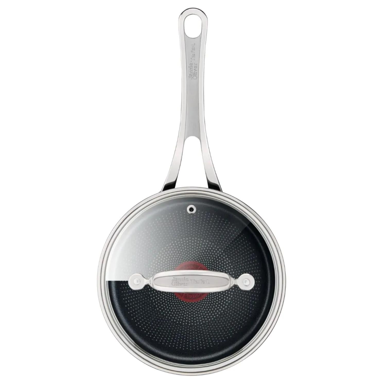 Take cooking to the next level with the new Jamie Oliver by Tefal Cook’s Classics range. Expertly crafted from tough hard anodised aluminium, this premium cookware is designed for a lifetime of professional-style home cooking. Beneath the anodised surface, a solid aluminium core provides excellent heat conduction for fast and even cooking. On top, we’ve added our superior non-stick coating infused with titanium for enhanced performance, easy clean-up, and extreme scratch resistance – even when using metal utensils. For peace of mind, the coating is completely toxin-free*. We’ve made these pans 10mm deeper to suit a broader range of culinary uses, and added internal measurements to saucepans and stewpots, so you can gauge quantities inside. And riveted stainless-steel handles with silicone inserts provide a secure grip and more comfortable cooking experience. To really up your cooking game, all pots and pans now feature our new Thermo-Signal™ technology: when the hourglass disappears, the pan is at the optimal cooking temperature. And with extra-thick Thermo-Fusion™+ bases, this cookware heats quickly and evenly on all hobs, even induction. For added versatility, you can use this range in the oven‡. Better still, it’s dishwasher-safe. Did we also mention it’s guaranteed for 2 years? Happy days!
