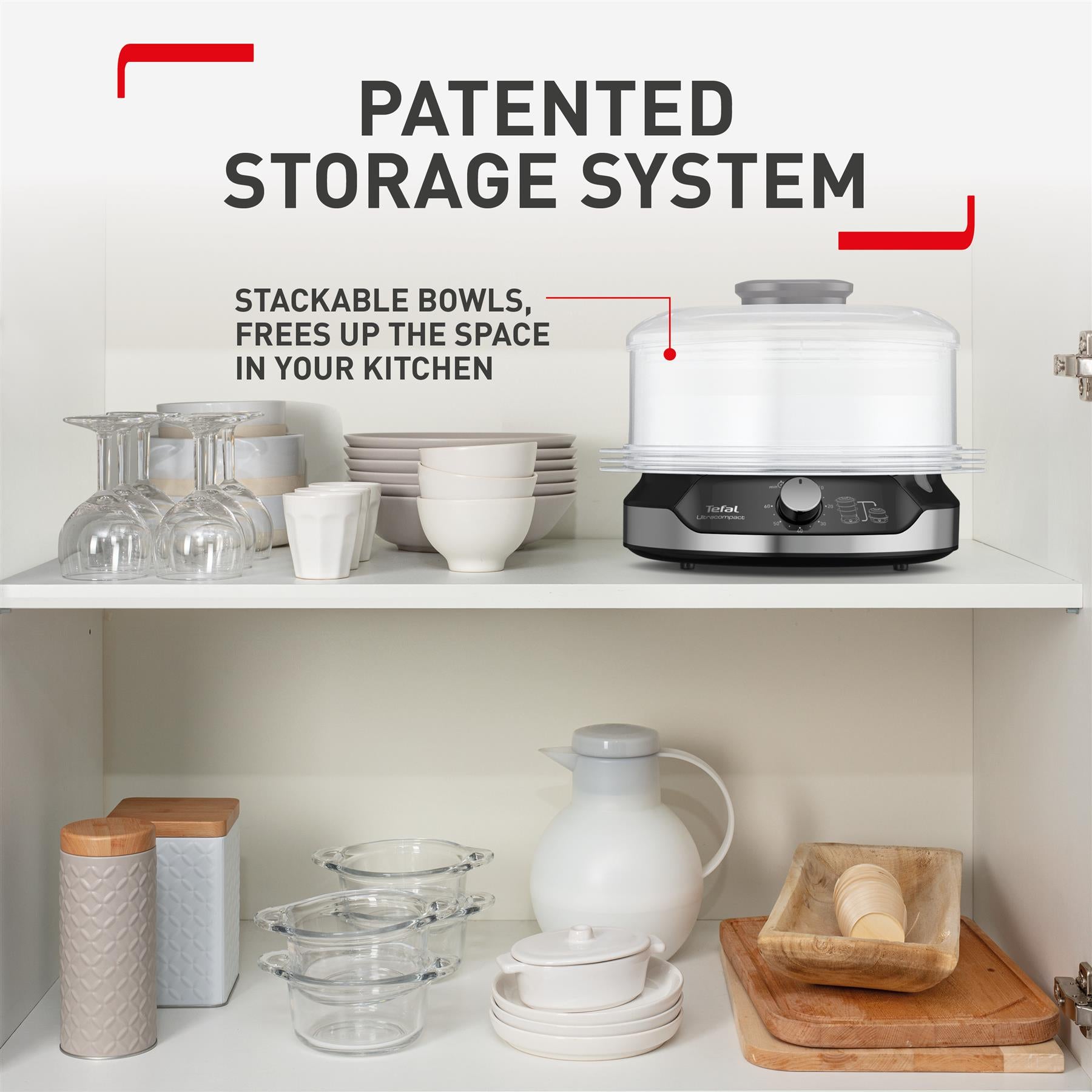 Designed for maximum convenience and hassle-free steaming, the Tefal Ultracompact Steam Cooker offers healthy and delicious meals for the whole family. The large capacity 3 bowl multi-tier steaming system was designed to cook your entire meal in one pass, with an ingenious patented stackable design for ultra-compact storage with total ease and BPA-free bowls for healthy cooking results. Healthy Cooking: Low-fat steam cooking maintains maximum vitamins and nutritional value; BPA-free bowls for total peace of mind. Easy to use: Smart features like a 60-minute timer, an indicator light during heating, 6 spots in each bowl to cook eggs, an easily viewable water level and unlimited autonomy with the ability to refill water while steaming is in progress. Easy to store: A convenient steam cooker with a patented ultra-compact storage system with stackable bowls (including rice bowl) on the base. Perfect capacity: The large 9L capacity 3-bowl multi-tier system uses three steaming bowls at once, saving time while offering enough for special occasions and everyday use. Generous rice bowl: A large 1L rice bowl, ensuring enough rice for the whole family.