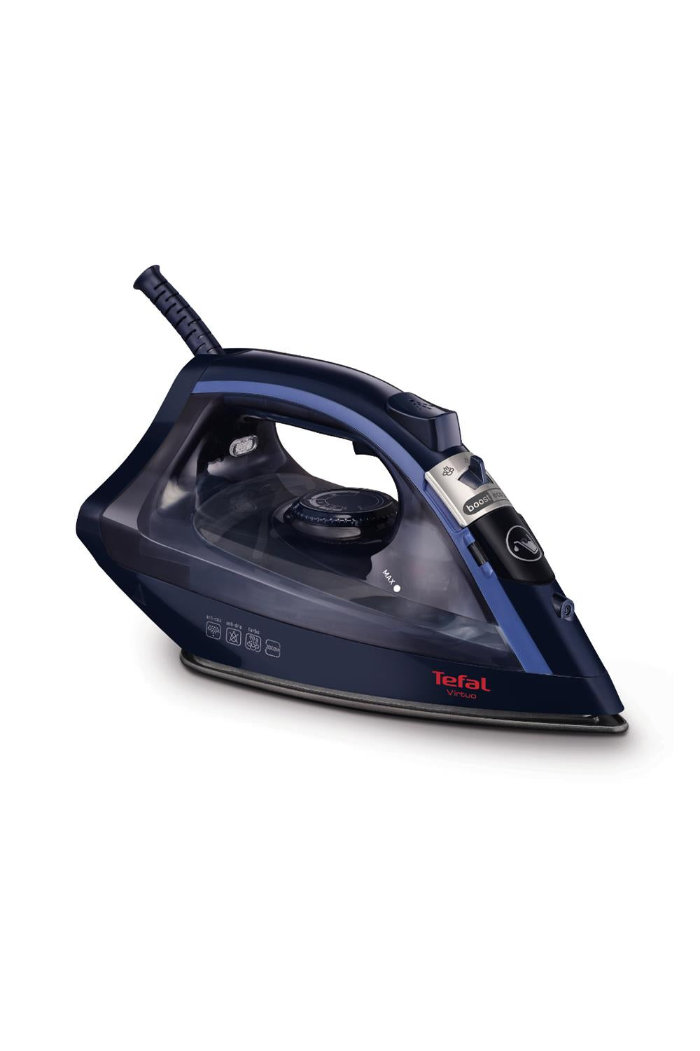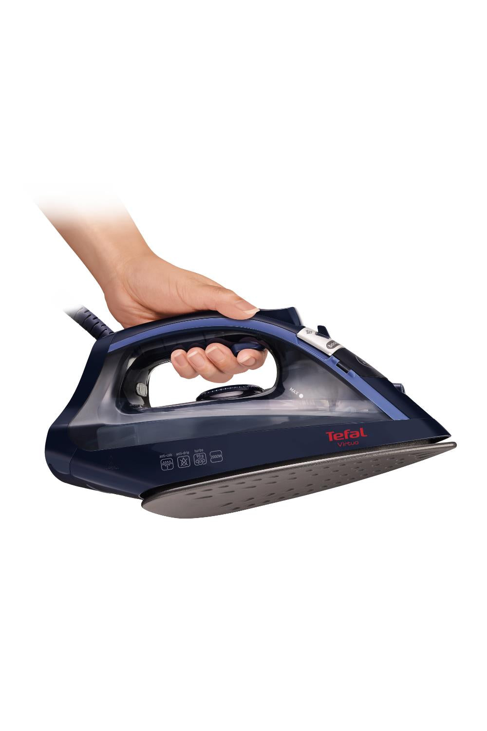 Iron easier and faster with the Tefal Virtuo steam iron. With 2000W behind it, this sleek iron is quick to heat up and takes out even the toughest creases in a flash. With a larger* non-stick soleplate, Virtuo covers more fabric in one stroke. That'll speed up your ironing! Plus, don't worry about any water drops this Tefal iron has an anti-drip feature. Anti-scale and self-clean functions make it easy to keep this Tefal steam iron performing at its best. Plus, it's got a generous 200ml water tank to avoid constant refills and a long 1.9m cord for freedom of movement. Steam iron with 2000 W power for easy ironing with a continuous steam output of 24 g/min. and a steam boost of 90 g/min. For efficient results. Durilium soleplate provides excellent gliding results and high efficiency, with steam holes at the tip, sides and even in the middle of the sole for maximum steam distribution. Easy ironing of thick or delicate fabrics, such as linen or silk, without fear of burns. The continuous steam output of up to 24 g/min. Provides ideal performance for highly efficient ironing sessions. Thanks to the drip stop system, you can avoid stains on clothes.