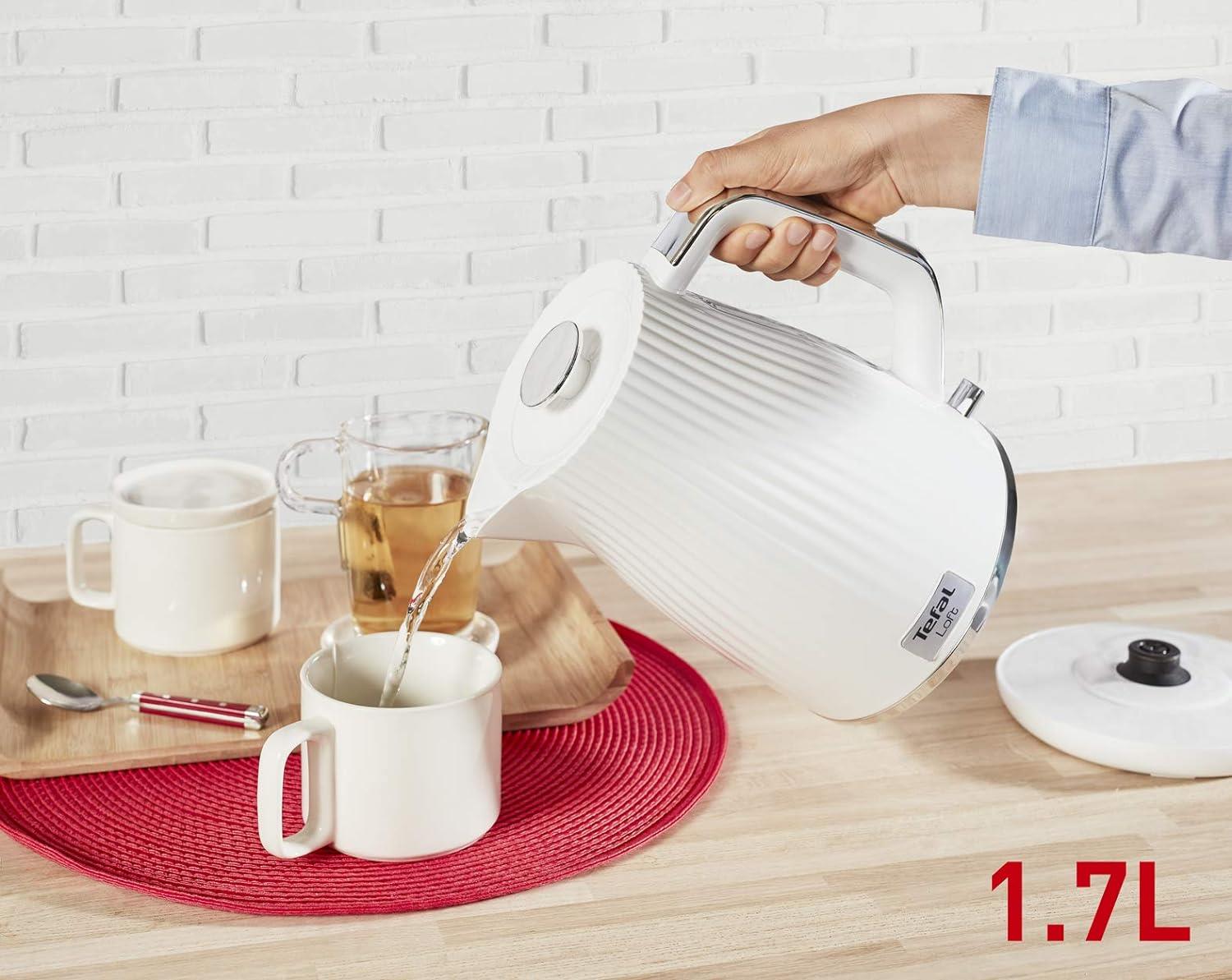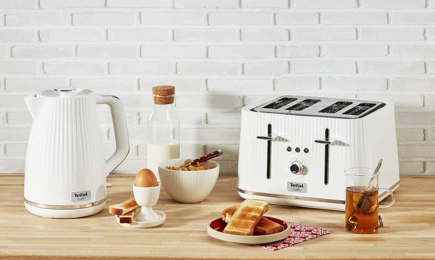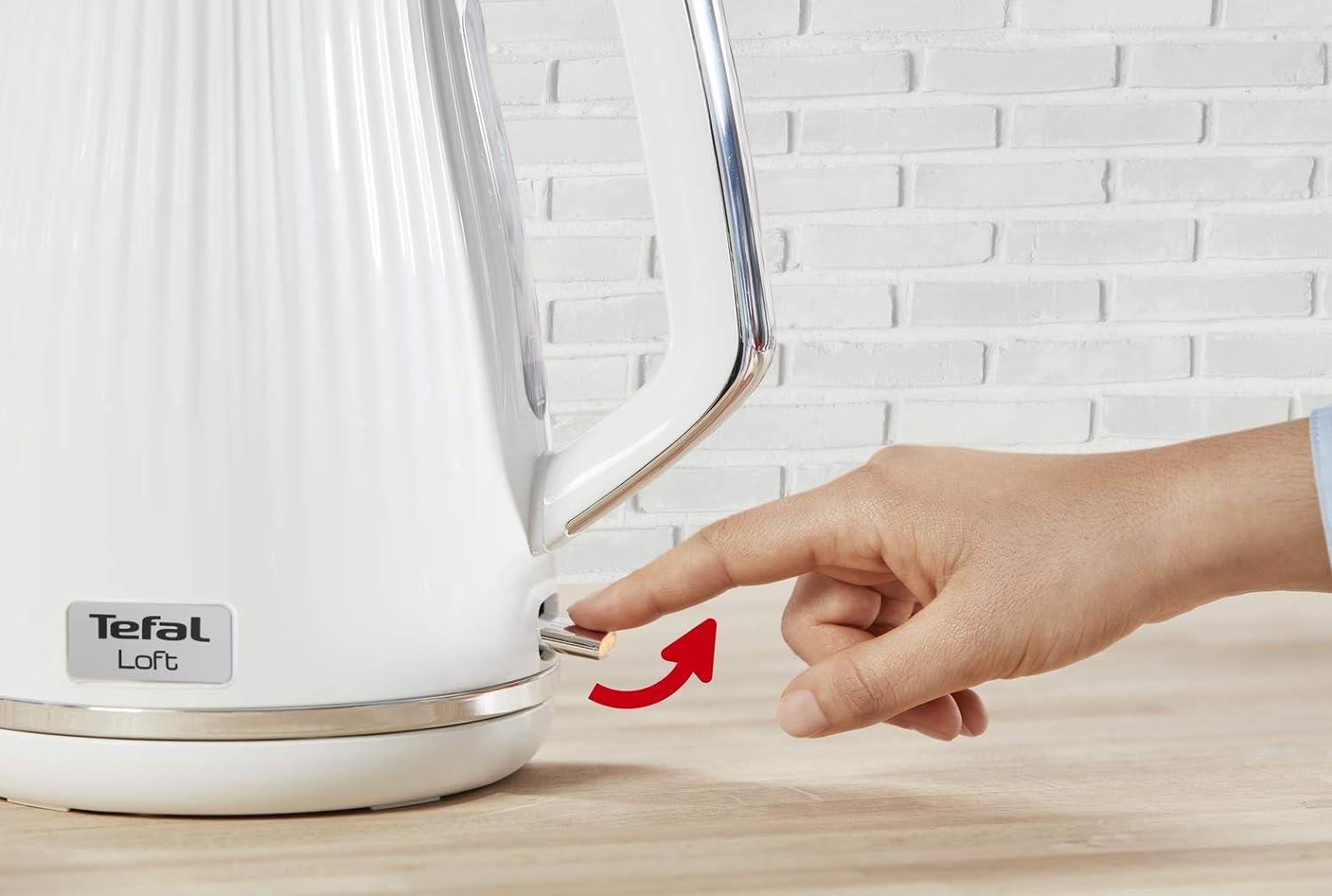 Timeless British design meets modern functionality in a distinctive kettle for the discerning kitchen. Add a touch of style to your kitchen worktop with Loft, the latest Tefal Breakfast set by British design Seymourpowell. Inspired by traditional British ceramics, this refined range features a distinctive fluted design and glossy, porcelain-like finish. In bold black with cool chrome hardware, the thoughtfully-designed kettle blends timeless classic details with a modern aesthetic that will complement your decor beautifully. By no means a small kettle, its generous 1.7L capacity means one boil will allow for up to seven drinks great for entertaining. A handy light indicator tells you when the kettles on, while auto shut-off keeps it from boiling dry. Its got a vintage-style pull-off lid for easy filling and a water-level window to tell you when its time for a top-up. The narrow spout ensures precision pouring without spilling a drop. Plus, because the jug is cordless and rotates a full 360° on the base, its easy to pick up and pour from anywhere on your worktop. This 1500W kettle boils water in no time, so you'll never wait long for that much-needed brew. Even better, the heating element is concealed, protecting it from limescale and making the interior smooth for easier cleaning. It also has a removable anti-scale filter, so you can enjoy great-tasting drinks, boil after boil.