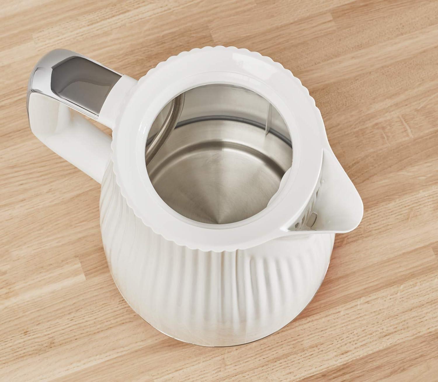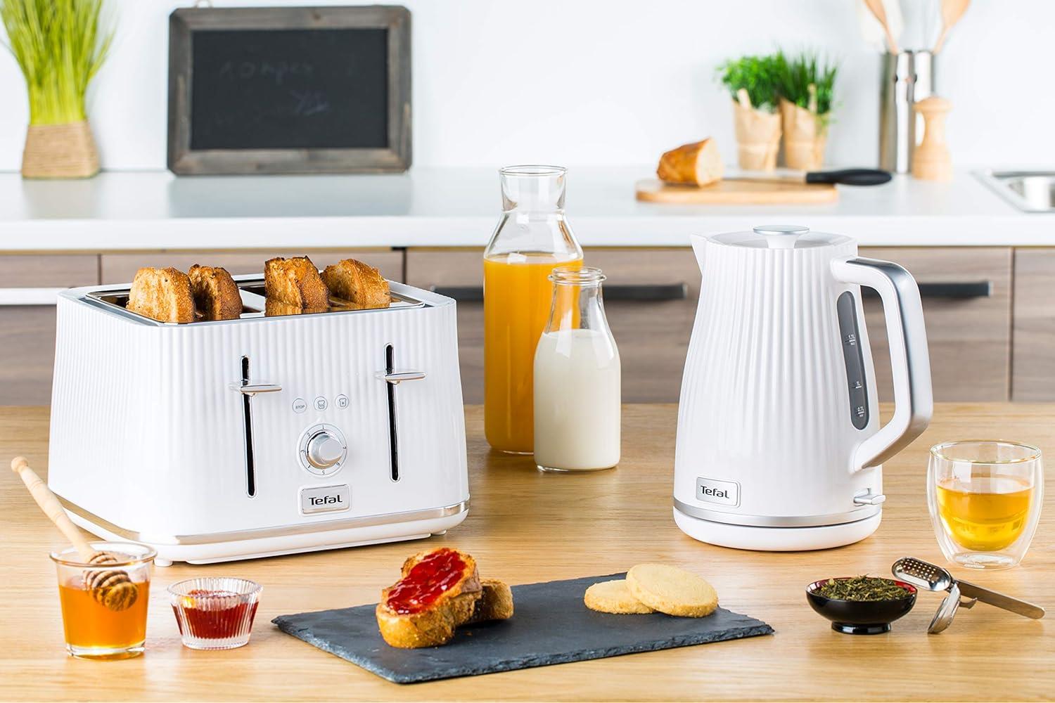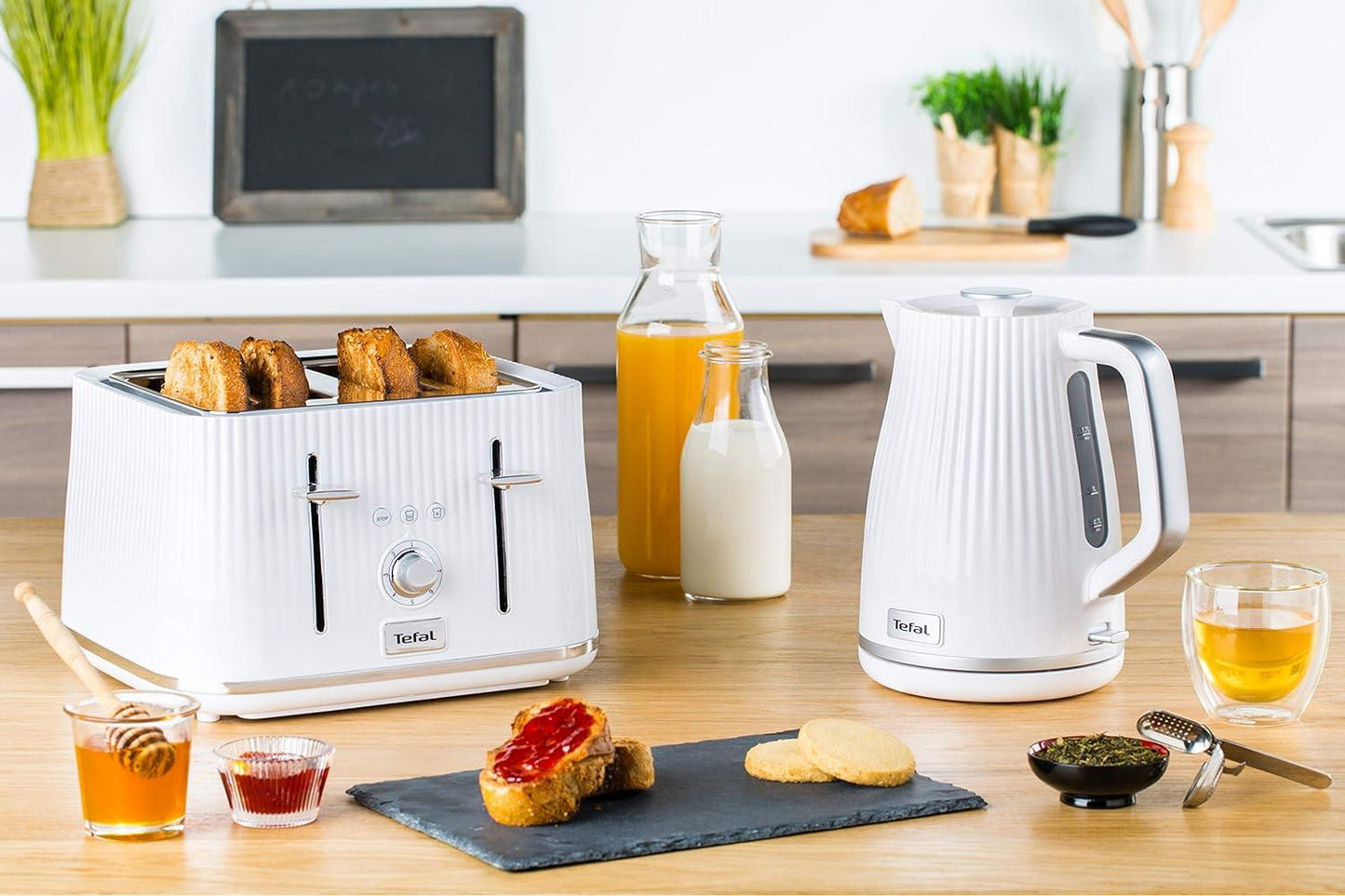 Timeless British design meets modern functionality in a distinctive kettle for the discerning kitchen. Add a touch of style to your kitchen worktop with Loft, the latest Tefal Breakfast set by British design Seymourpowell. Inspired by traditional British ceramics, this refined range features a distinctive fluted design and glossy, porcelain-like finish. In bold black with cool chrome hardware, the thoughtfully-designed kettle blends timeless classic details with a modern aesthetic that will complement your decor beautifully. By no means a small kettle, its generous 1.7L capacity means one boil will allow for up to seven drinks great for entertaining. A handy light indicator tells you when the kettles on, while auto shut-off keeps it from boiling dry. Its got a vintage-style pull-off lid for easy filling and a water-level window to tell you when its time for a top-up. The narrow spout ensures precision pouring without spilling a drop. Plus, because the jug is cordless and rotates a full 360° on the base, its easy to pick up and pour from anywhere on your worktop. This 1500W kettle boils water in no time, so you'll never wait long for that much-needed brew. Even better, the heating element is concealed, protecting it from limescale and making the interior smooth for easier cleaning. It also has a removable anti-scale filter, so you can enjoy great-tasting drinks, boil after boil.