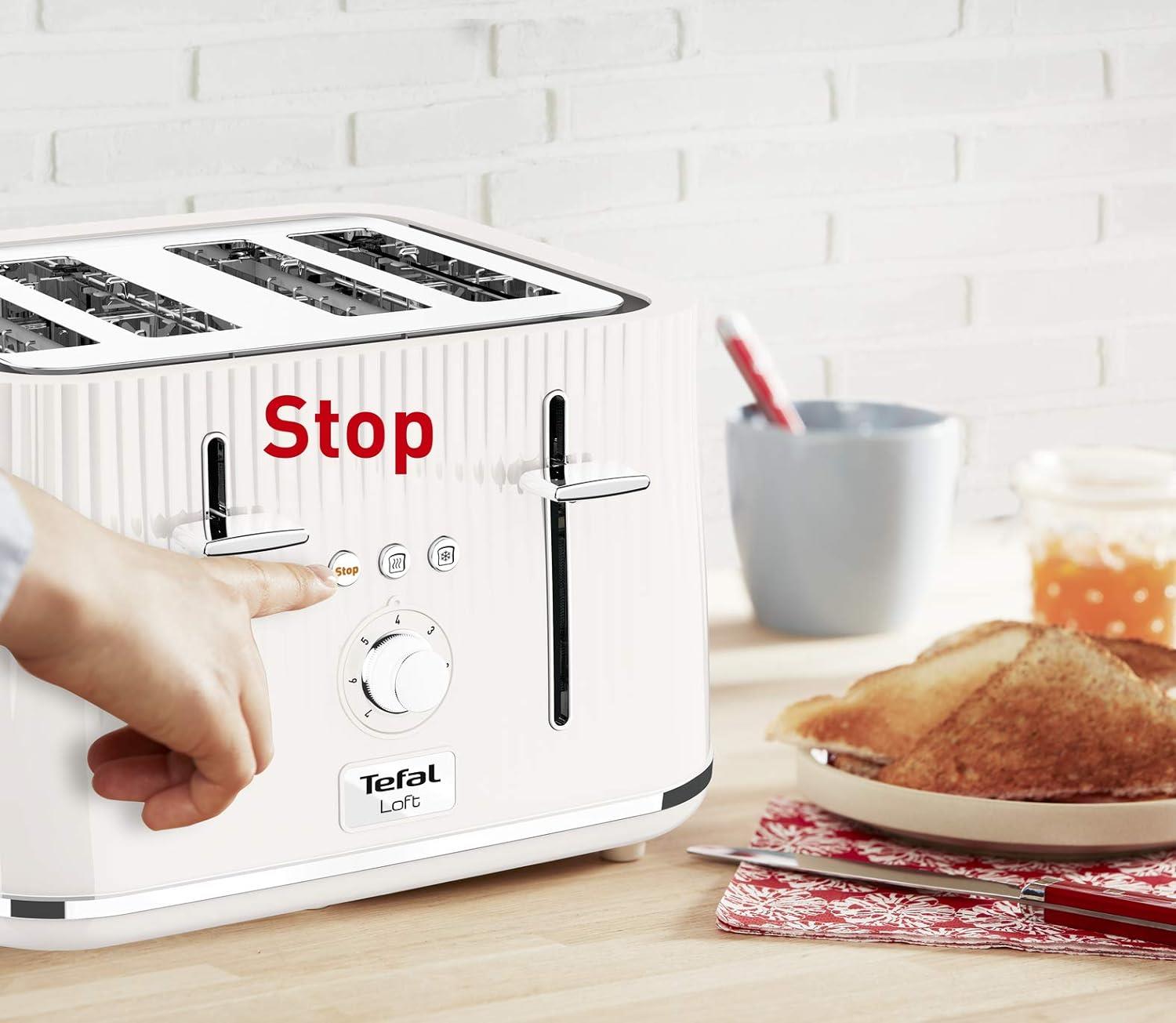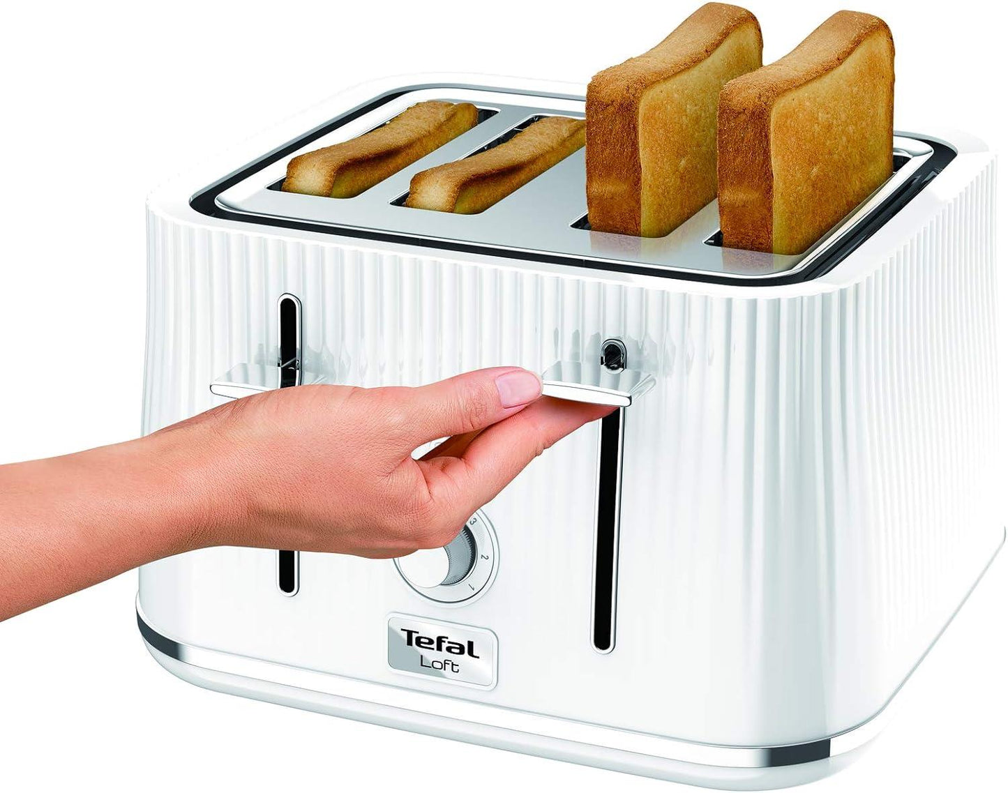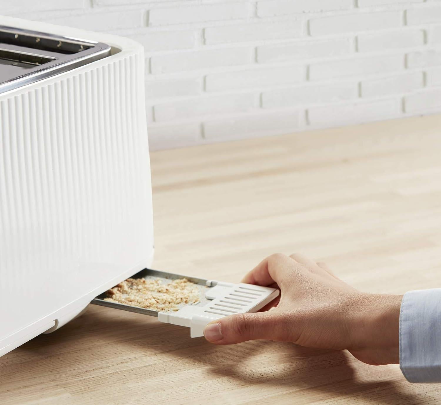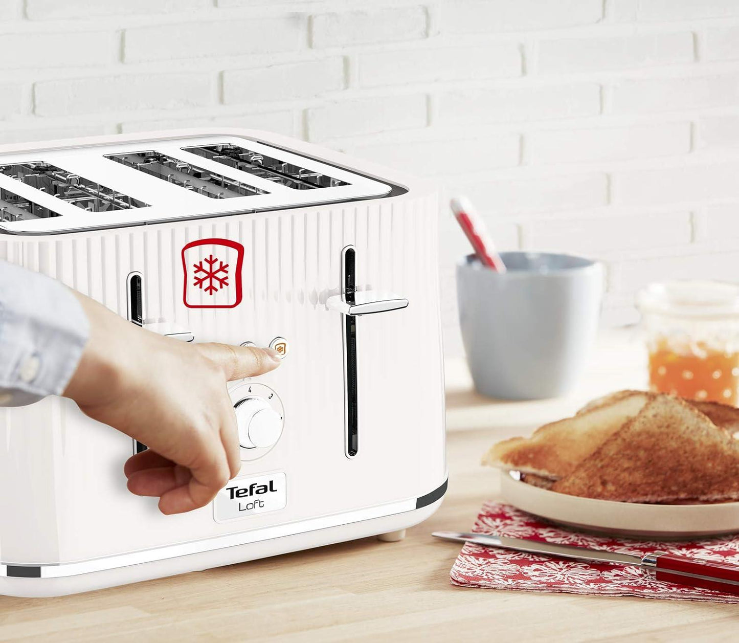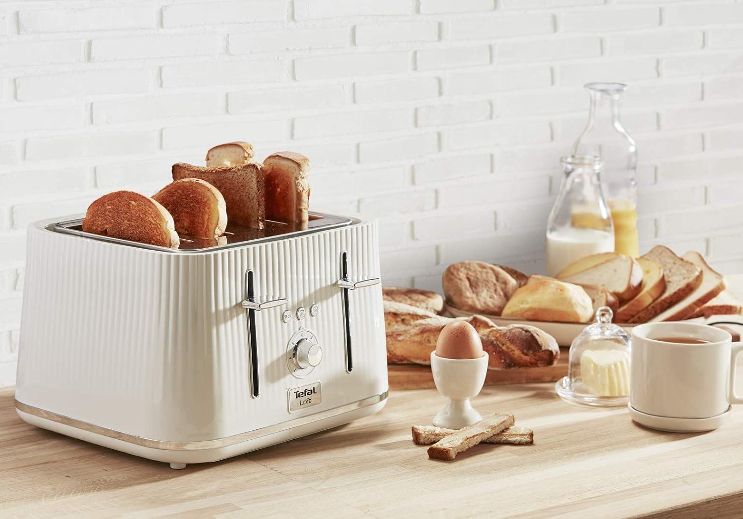 Add a touch of style to your kitchen worktop with Loft, the latest Tefal Breakfast set by British design Seymourpowell. Inspired by traditional British ceramics, this refined range features a distinctive fluted design and a glossy, porcelain-like finish. In bold white with cool chrome hardware, the elegant toaster has four extra-wide slots, ideal for thin and thick slices of bread, as well as bagels, crumpets and teacakes. Two toasting chambers mean you can toast two or four slices at once – enough to feed one or breakfast for the whole family. A choice of seven browning levels allow for customised toasting. Left your loaf in the freezer? No problem; the ‘defrost’ setting thaws frozen bread in a flash. There’s also a ‘reheat’ setting to keep your toast warm, plus ‘stop’ to pop up your bread at any time during the toasting cycle, and each setting illuminates when selected. The high-lift lever makes it easy to grab small items, like English muffins, without burning your fingers, while two removable crumb trays – one on each side – keep the worktop tidy and make clean-up a breeze. Just slide the trays out to discard the crumbs and keep your Tefal toaster in tip-top condition.